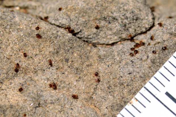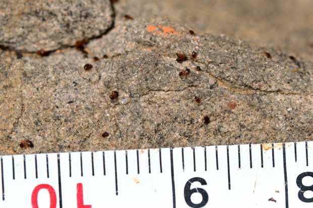Me acerqué al lugar de uno de los avisos. Y vi que los ácaros coincidían en aspecto y comportamiento con los que llevaba años intentando identificar. Se activaban con el sol, corrían en todas direcciones y se producían unos contactos en parejas que tenían toda la pinta de ser un encuentro sexual. Un ácaro se subía sobre otro y permanecían alrededor de un minuto. También coincidían en la forma, el tamaño y el color. Me llevé una muestra. Y cuando los observé con la lupa binocular y los comparé con muestras que guardo de otros lugares desde hace años, supe que se trataba de la misma especie. En las imágenes 1 y 2, se pueden ver los ácaros en unas imágenes que conservo de 2016.