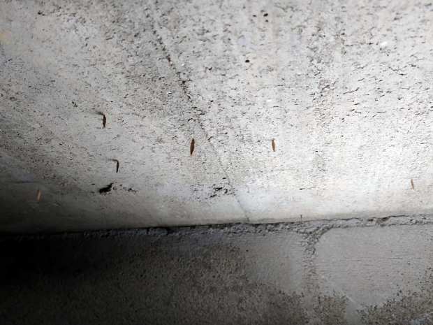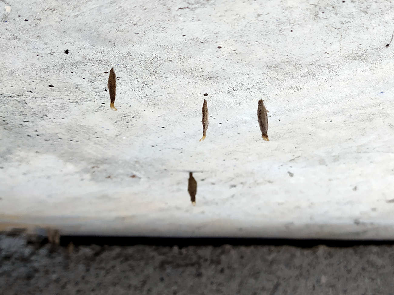En las imágenes 1 a 3, se puede ver un cadáver seco de ratón doméstico a principios del pasado mes de noviembre. Sobre el ratón hay tres estuches de Phereoeca. Y en las imágenes 4 y 5, se puede ver imágenes del mismo cadáver de hoy, primer día de diciembre, donde hay dos estuches de mayor tamaño. Esto mostraría que las orugas se han alimentado bien del cadáver. Un lugar como esta cámara sanitaria es perfecto para la polilla del estuche. En las partes del techo que tocan a las paredes, había bastantes estuches colgados con los restos de la cutícula de la crisálida saliendo por debajo, lo cual indica que salieron en forma de polillas (figuras  6 y 7).