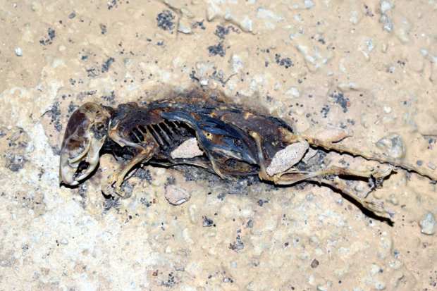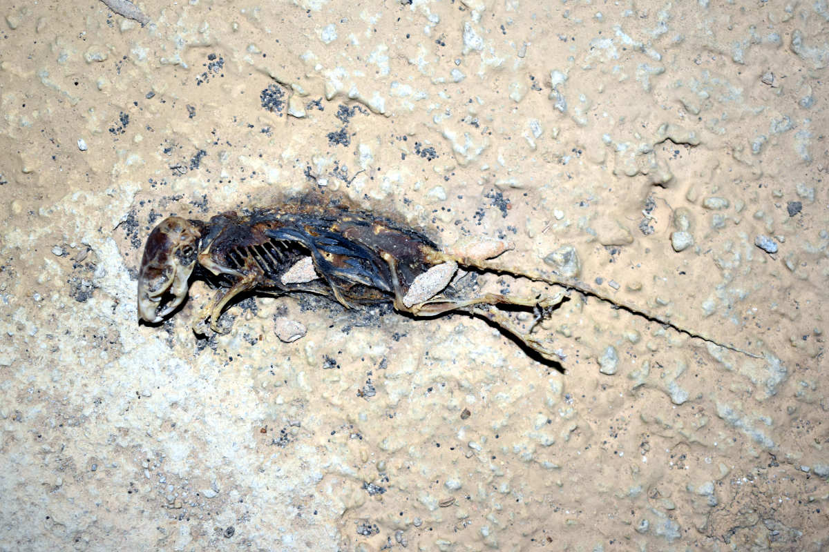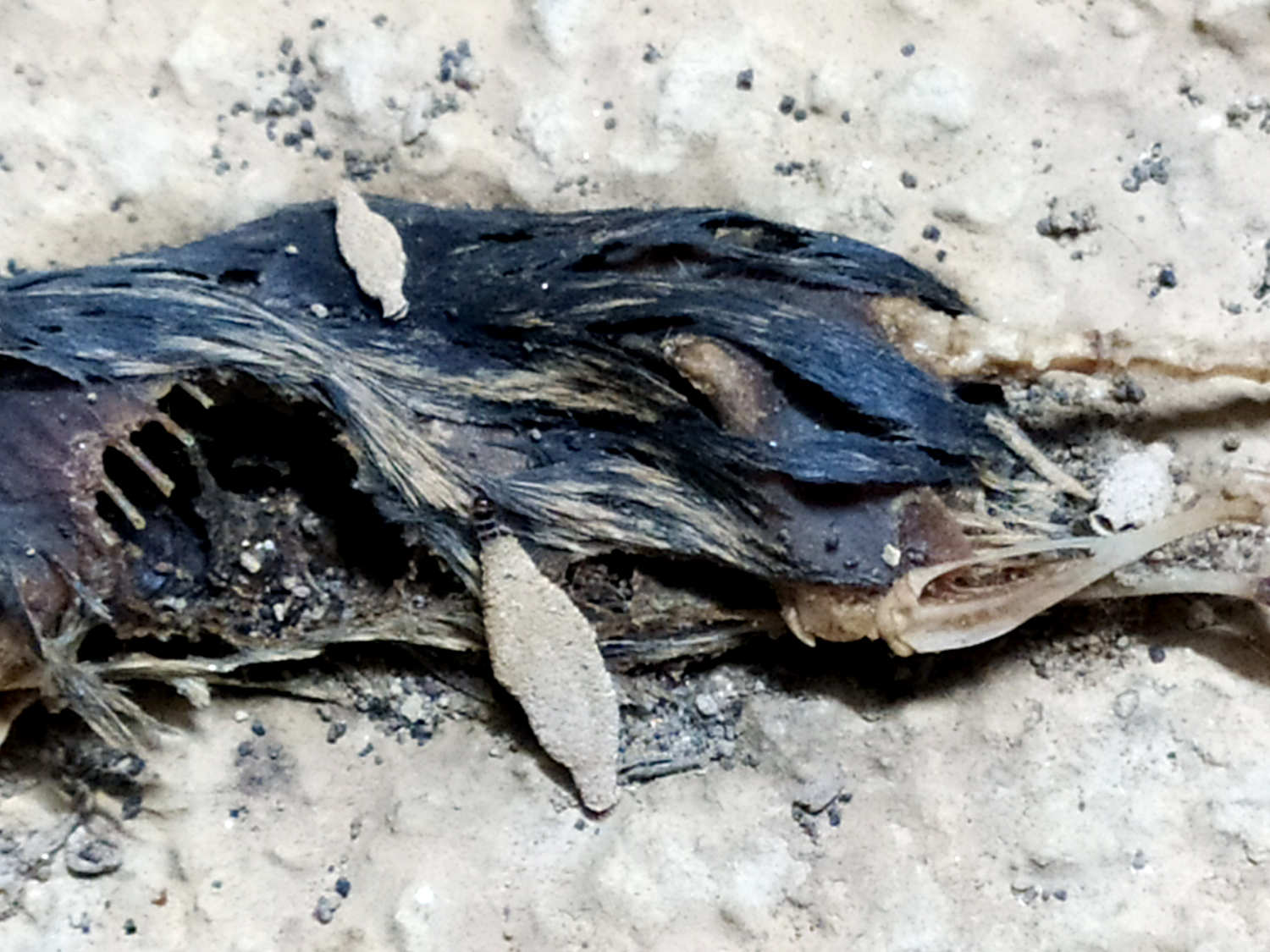 Fig 2. Orugas de Phereoeca sobre cadáver de ratón doméstico./ C. Pradera 11-2020