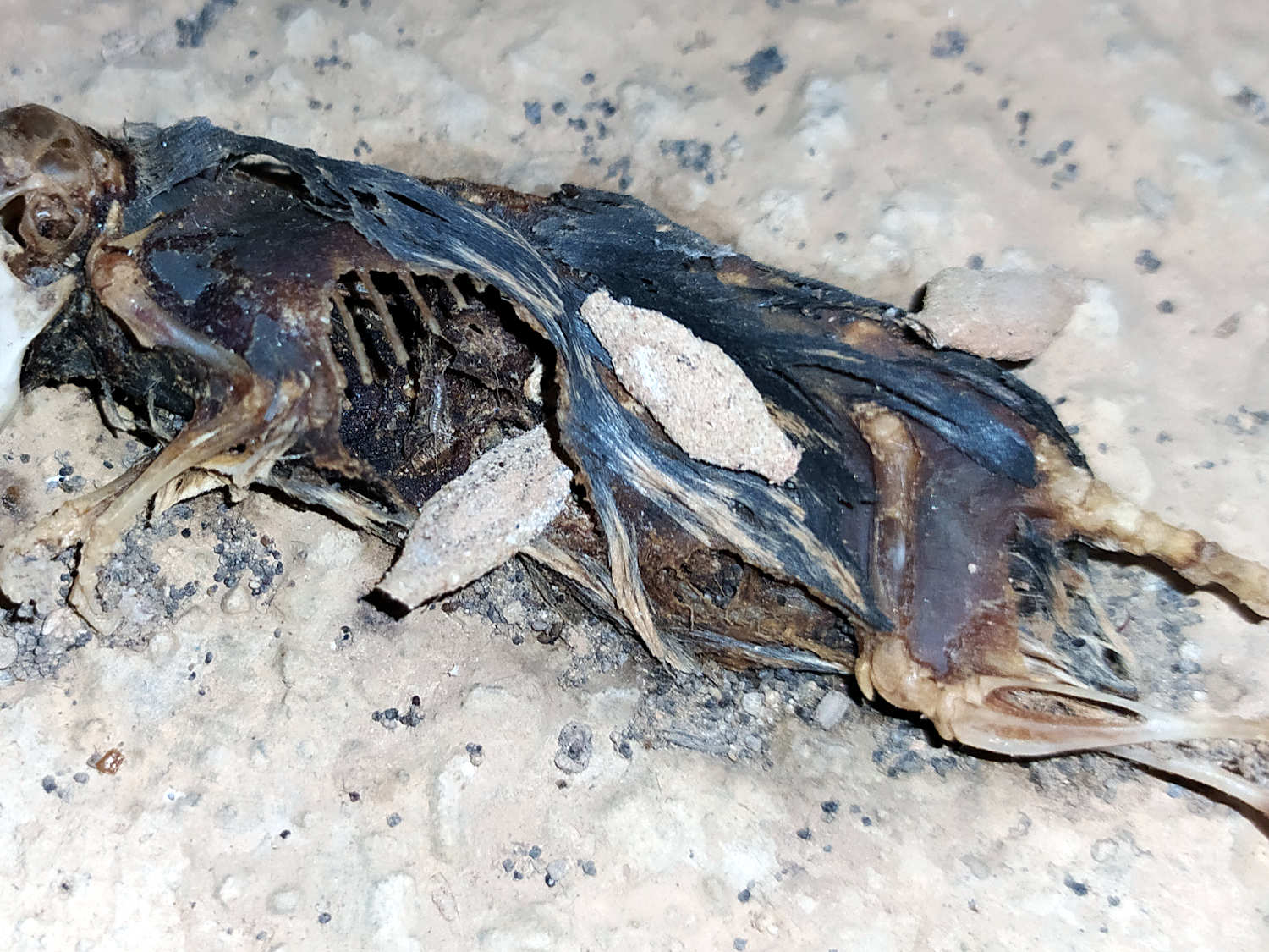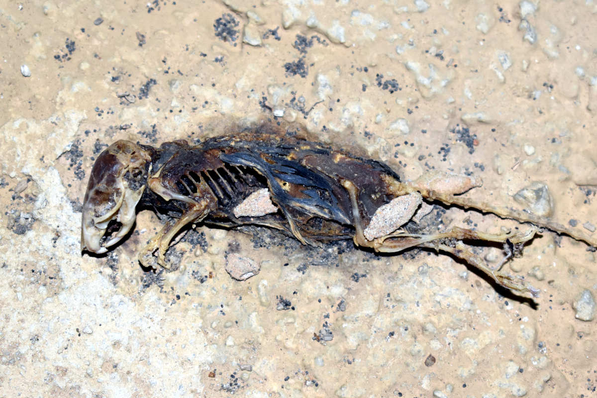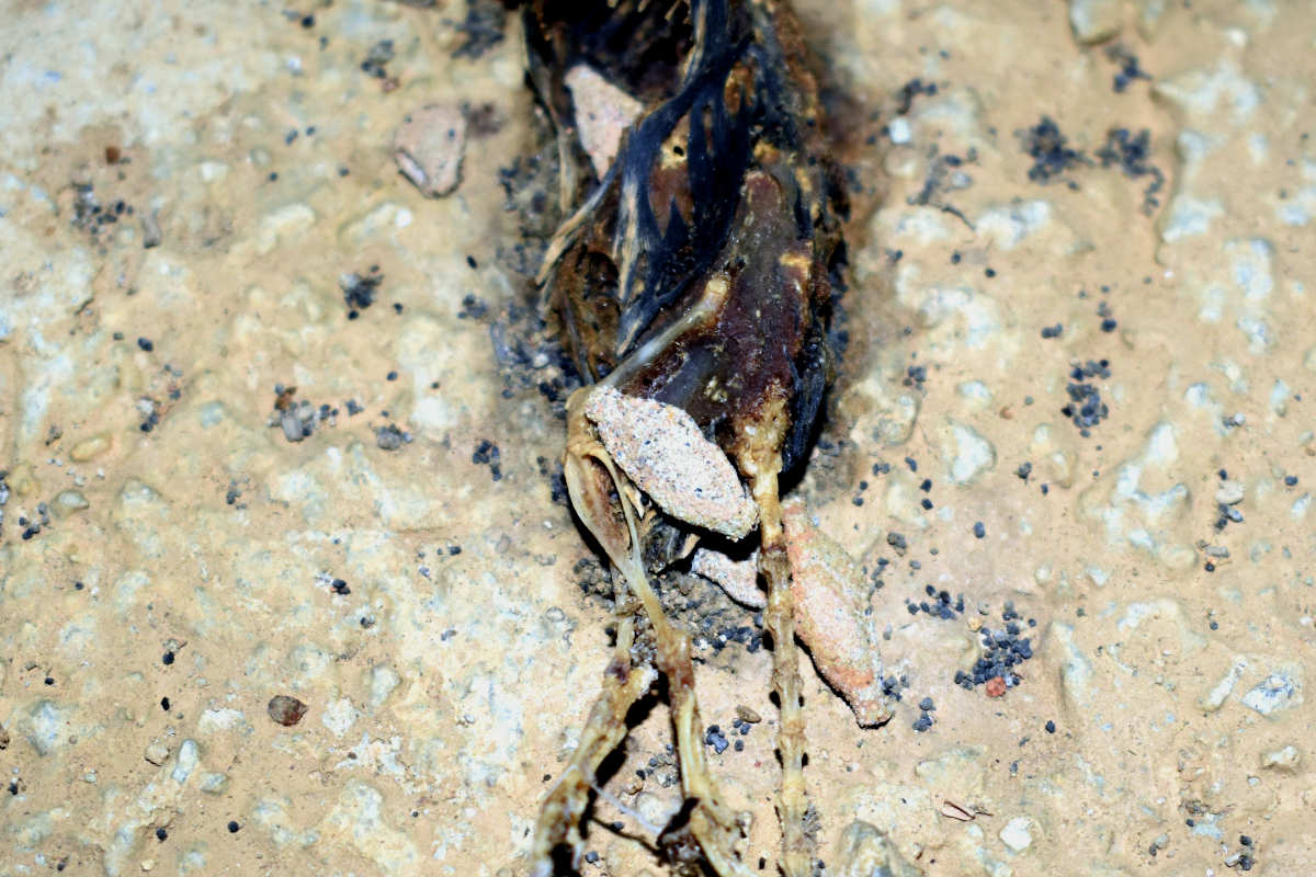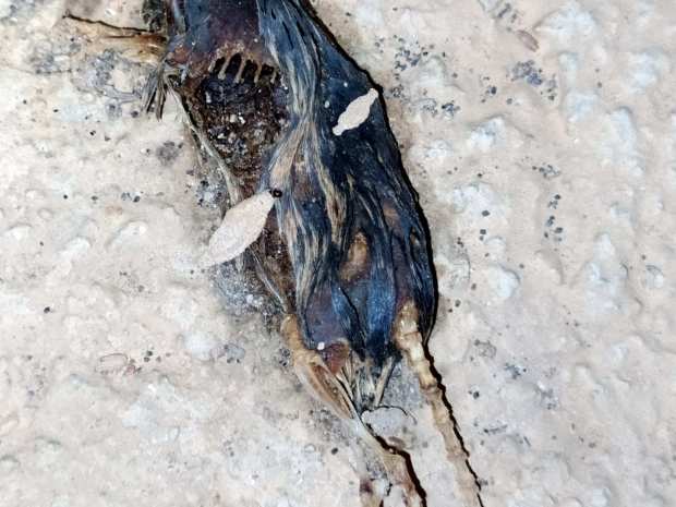 Fig 3. Orugas de Phereoeca sobre cadáver de ratón doméstico./ C. Pradera 11-2020