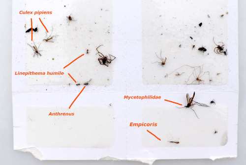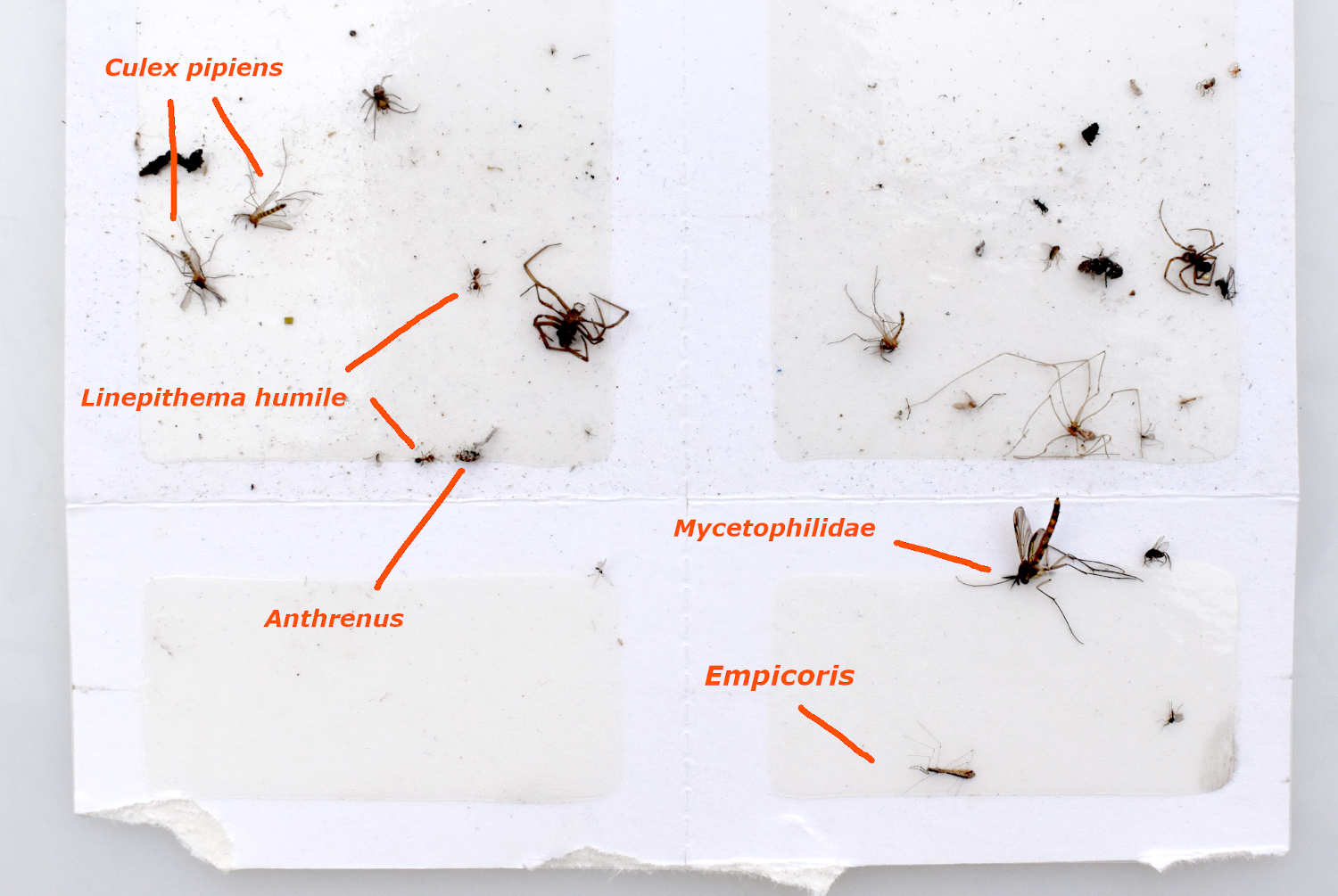 En la imagen número 2, se puede ver la trampa donde está atrapada en el adhesivo la chinche asesina. Mide cerca de 5 milímetros de longitud. Para hacerse una idea del tamaño, he indicado en la imagen otras especies. Visto esto, se entiende que Empicoris tiene en este sótano artrópodos suficientes a mano de los que alimentarse. Esto lo comento porque cuando buscas información sobre la biología de estas chinches, se explica que se encuentra en zonas húmedas y oscuras de áreas con plantas [1]. Sin embargo, alrededor del edificio no hay plantas ni árboles. En este caso, cabe la posibilidad de que esta chinche haya completado todo su ciclo en el sótano. He constatado esto para la especie Reduvius personatus en granjas de cerdos y en una fábrica de pienso donde esta especie es común.