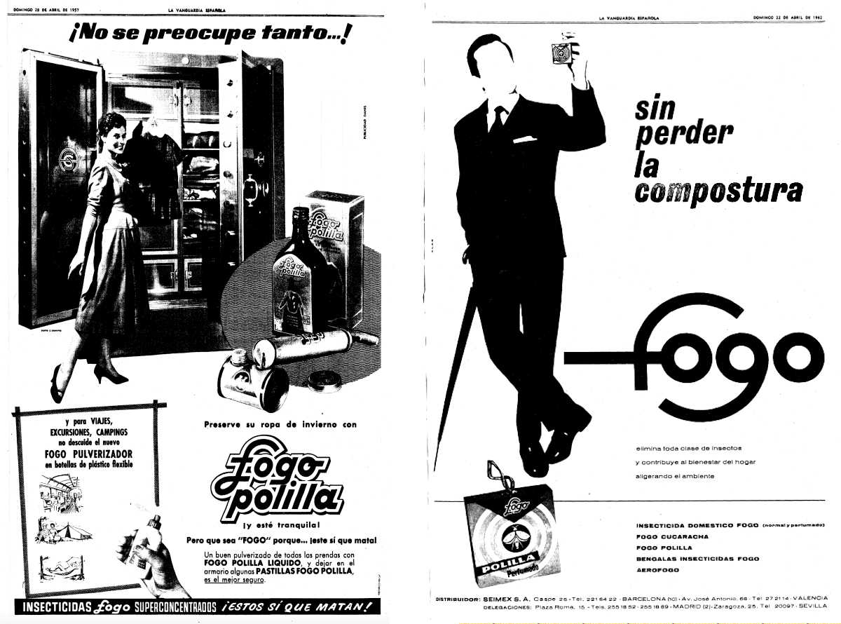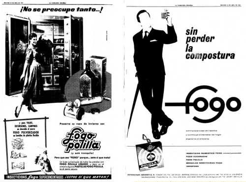 Fig 3. Anuncios de Fogo Polilla de 1957 y Fogo Polilla Perfumado de 1962 publicados en La Vanguardia.