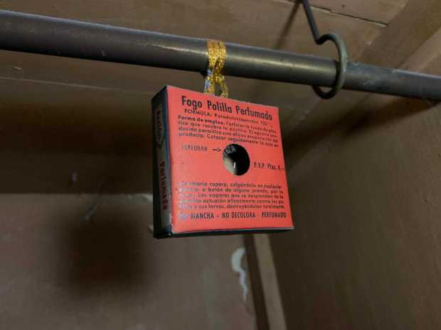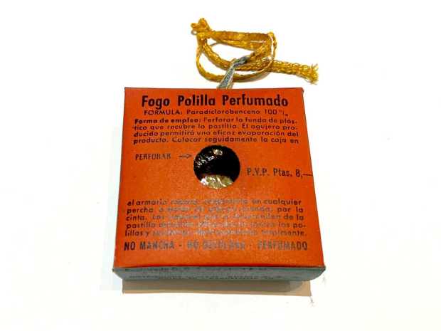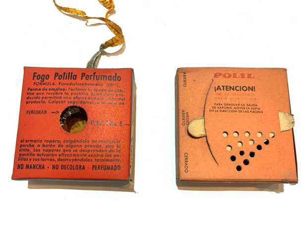 Fig 1. Envase de Fogo Polilla Perfumado en un viejo armario./ Raúl López 12-2020