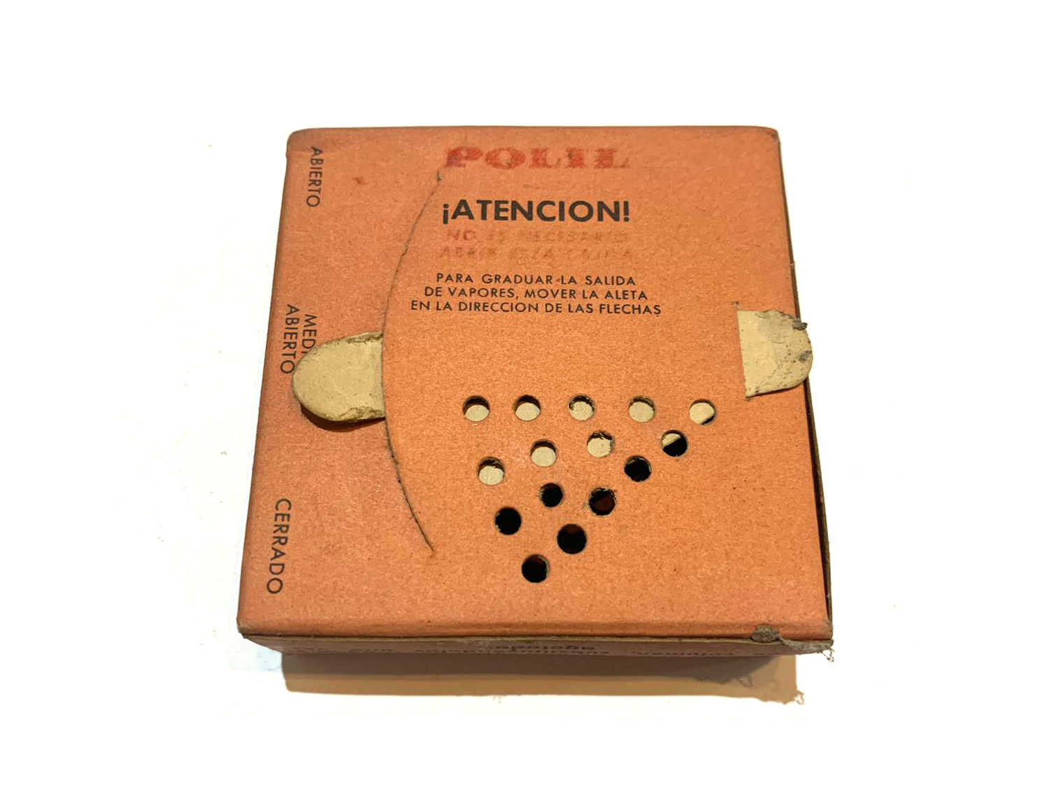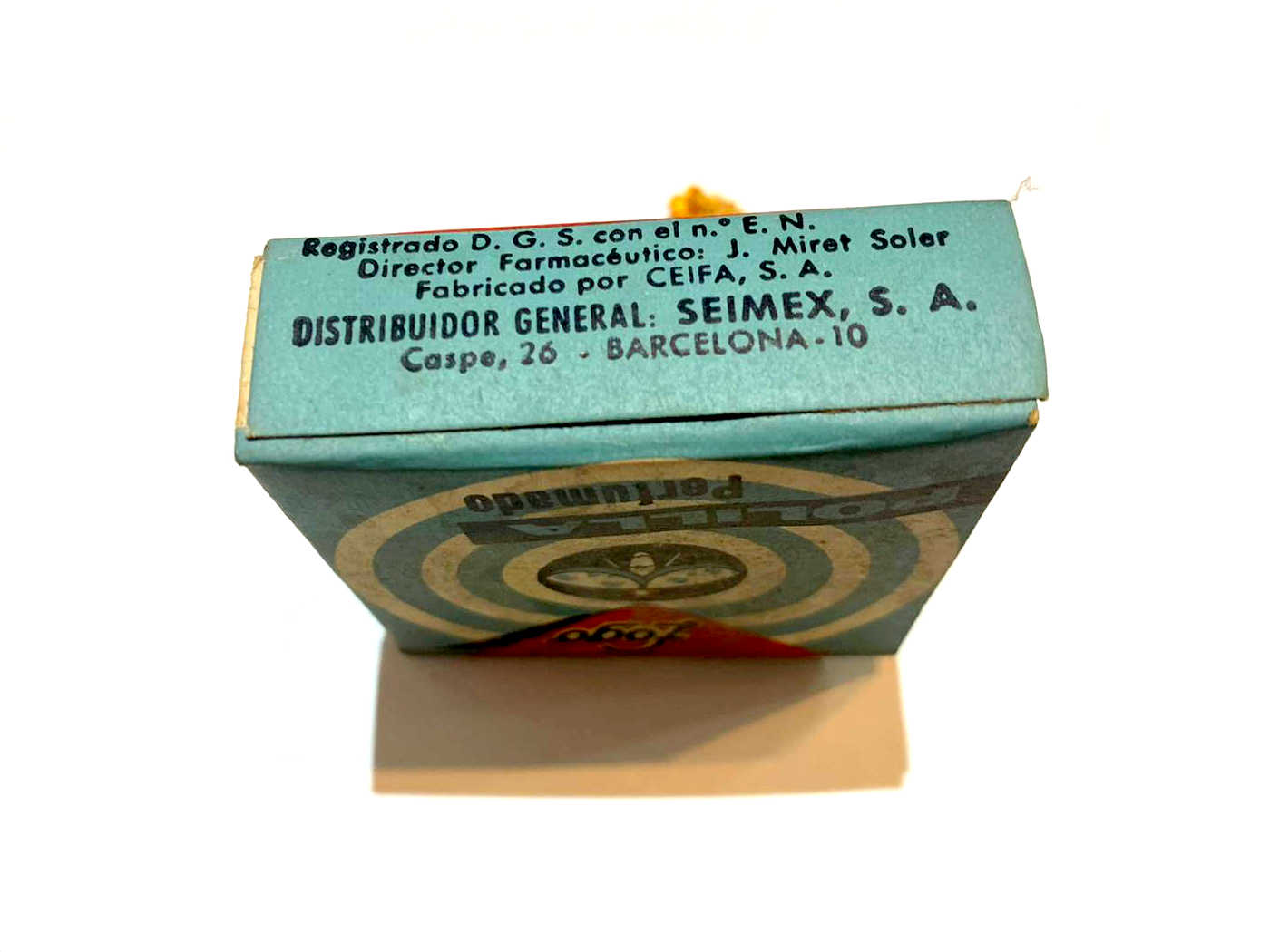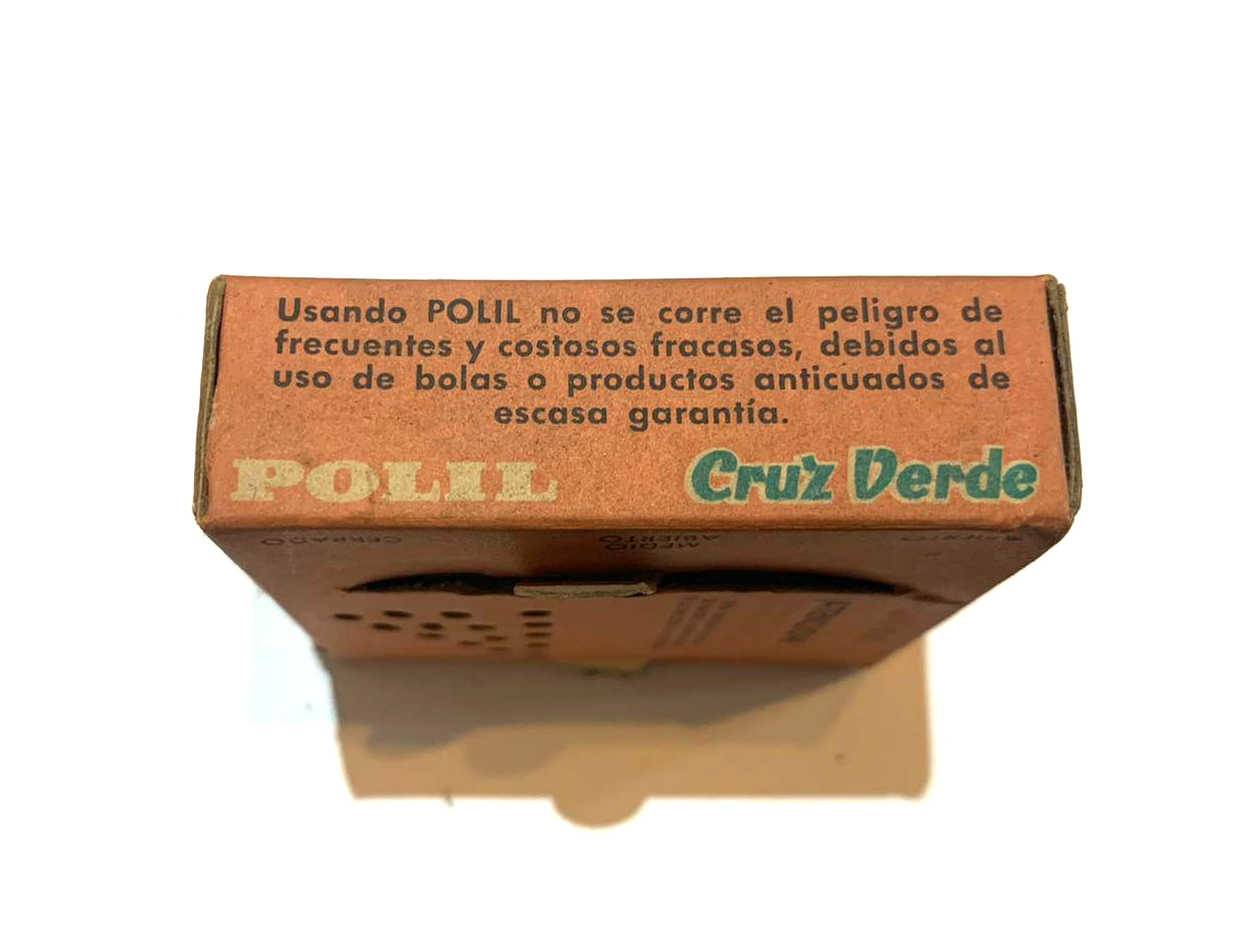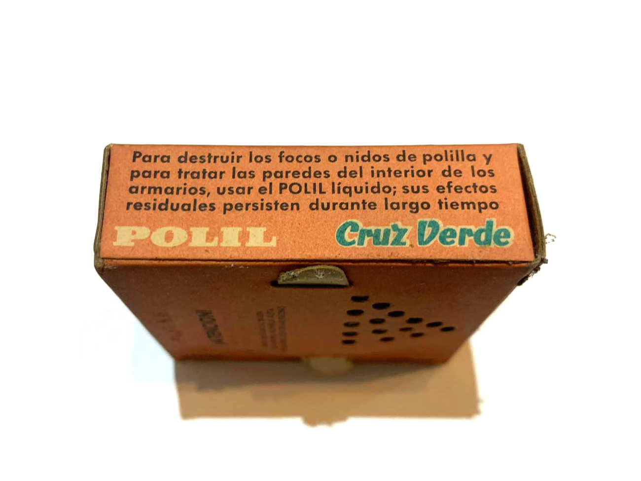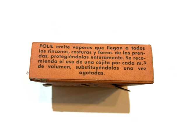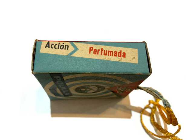 Le pedí a Raúl si podía tomar unas imágenes de detalle de los dos productos antipolillas. En las imágenes 6 a 18 se puede ver detalles de todas sus caras. Miden 6x6x2 cm. Una de las preguntas que surgió fue de qué año eran los productos. Respecto al antipolillas Fogo, por el diseño y tipo de letra del nombre de la marca pensé que serían de la década de 1960. Encontré un anuncio publicitario de Fogo Polilla Perfumado de 1962 publicado en el periódico La Vanguardia en el que la cajita que figura es como el encontrado en la vivienda (figura 3). Por otra parte el tipo de letra de la marca en el anuncio es diferente al de la cajita que figura. Parece un período de transición. Otro detalle es que en el anuncio aparece SEIMEX como distribuidor. Por un artículo que escribí sobre la marca Fogo en 2013 [1], sé que hacia 1958 CEIFA, el creador y fabricante de Fogo, entregó la distribución de sus productos a SEIMEX. Y a principios de la década de 1970, SEIMEX se quedó con la marca y pasó a producir los insecticidas. En la cajita aparece SEIMEX como distribuidor y no como fabricante.