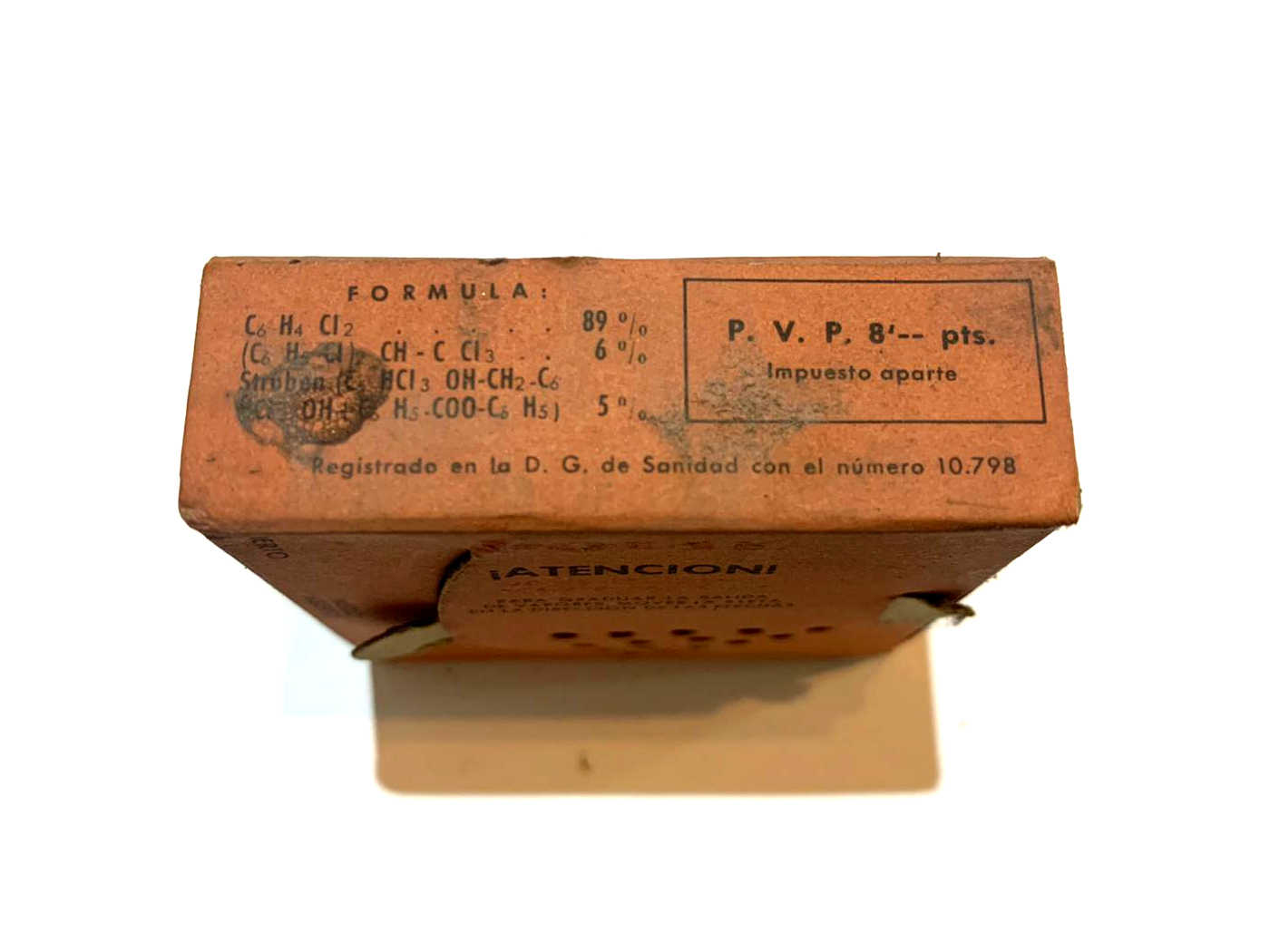 Respecto al producto Polil Perfumado, también creo que es de la década de 1960. Este producto parece que no existía en la década de 1950, pero sí existía la cajita evaporadora. En la imagen número 4 se pueden ver dos anuncios de Polil de 1954 y 1962. En el de 1954 se puede ver una cajita evaporadora redonda. Y la primera vez que aparece Polil Perfumado es en el anuncio de 1962 cuyo envase tiene un diseño parecido al que encontró Raúl. Ahora bien, un detalle importante es que en un lateral de la cajita de Polil aparece el número de registro sanitario. Se lee: «Registrado en la D. G. de Sanidad con el número 10.798» (figura 18). Según he recogido en anteriores entradas, este sistema de registro de los productos plaguicidas de uso doméstico estuvo en vigor hasta finales de la década de 1960. En la siguiente década se encuentra otro sistema de registro que consistía en un número seguido de unas letras de este modo: 000-DES o 000-RAT dependiendo si se trataba de un insecticida o un raticida [3].