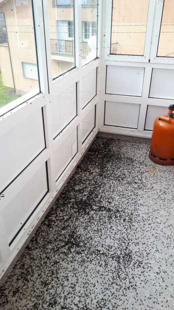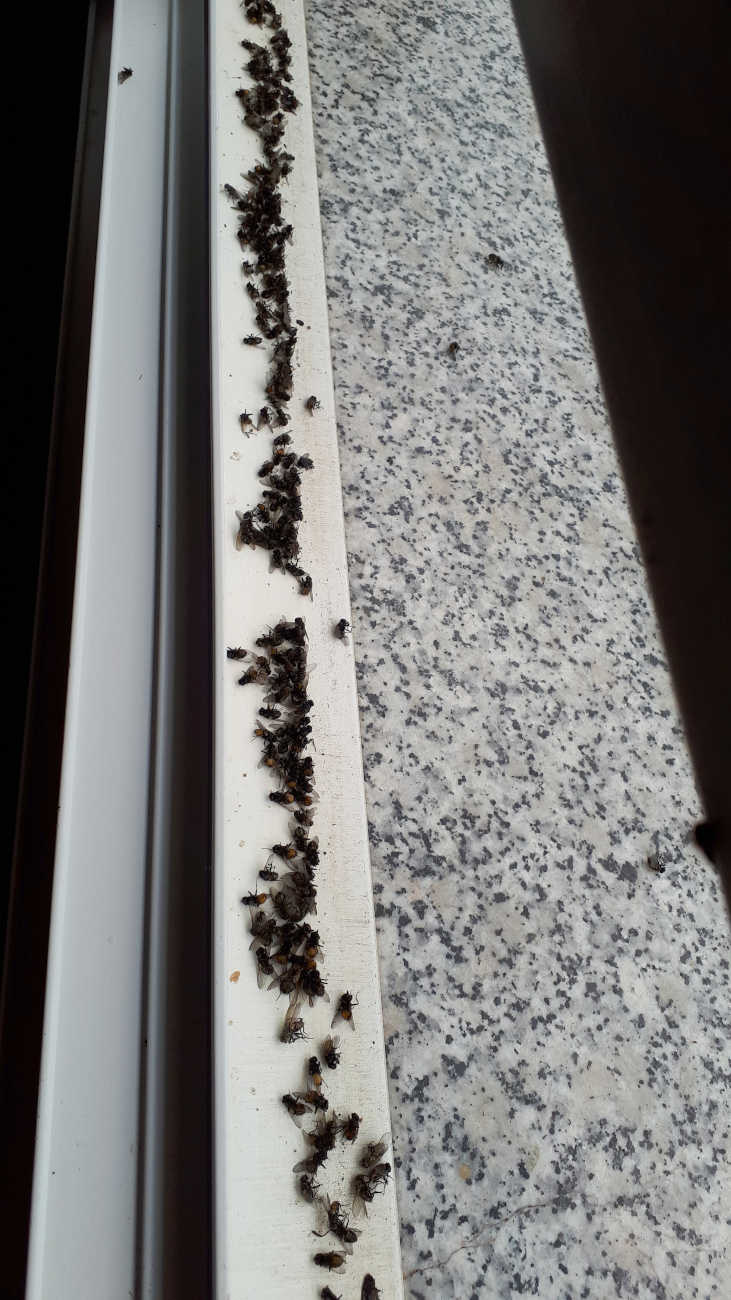 También a finales de 2018, una amable lectora me explicó un caso que sucedía en una vivienda de un pueblecito de Castilla y León situado a 900 metros. Tuvo la amabilidad de compartir unas ilustrativas imágenes que publiqué entonces [4]. Es un caso de los más severos que he visto. Hasta donde se puede observar, parece que haya básicamente una sola especie que todo apunta a que sea Musca autumnalis. Esto significa que en ese pueblo habría bastante ganado vacuno y también caballar. Esto último no se lo consulté.