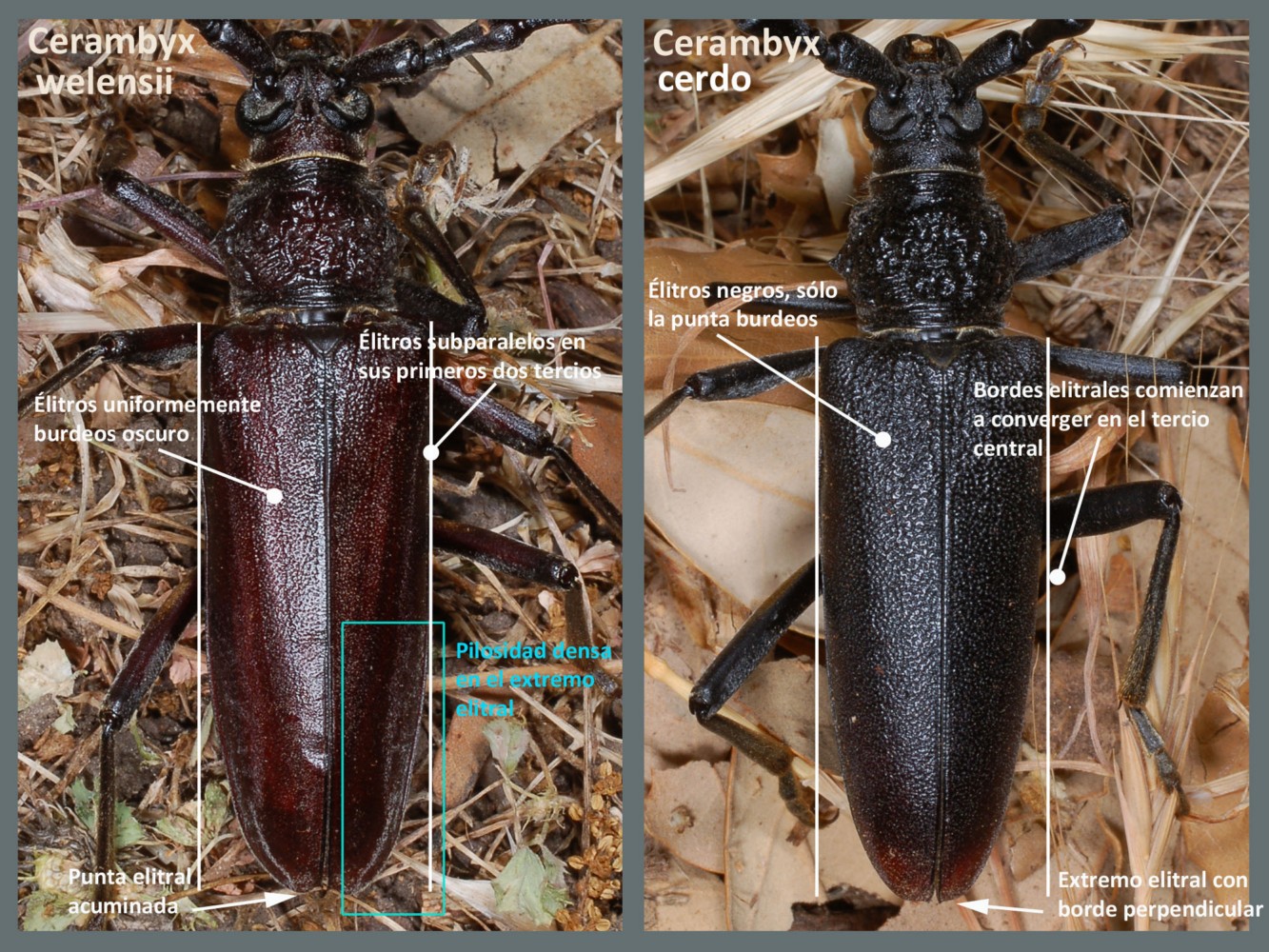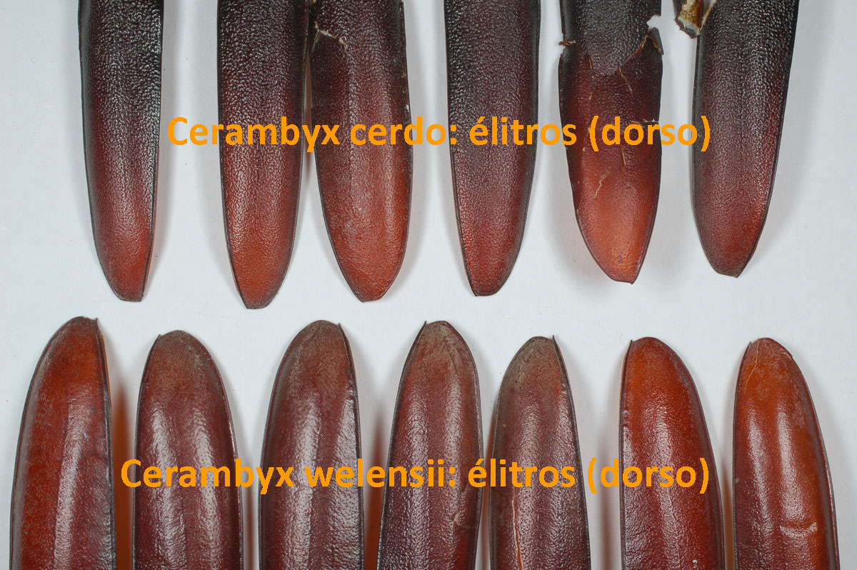 En la imagen número 3, se puede ver otra excelente fotografía de Ángel Martínez en la que se muestran élitros de ambas especies. Como se puede observar, la forma del ápice es diferente. En C. welensii la punta es redondeada y tiene una pequeña punta. En cambio, en C. cerdo la punta es plana. También se aprecia claramente la pilosidad como si de un polvillo se tratara. Esta pilosidad es un buen detalle que se observa bien en algunas fotografías. Por otra parte, en esta especie los élitros son subparalelos en los dos primeros tercios, mientras que en C. cerdo empiezan a convergir hacia la mitad.