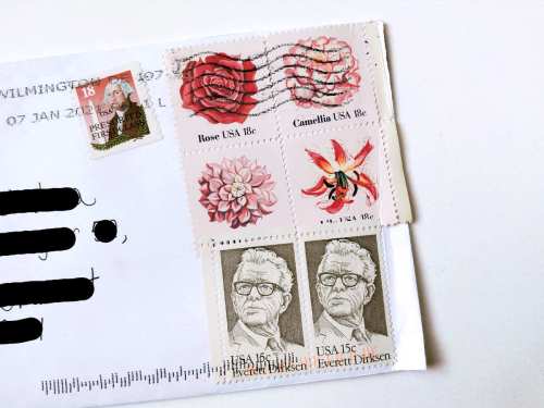 Los sellos que he adquirido miden 4 x 5 cm aproximadamente. El precio está indicado en francos CFA de África Occidental. Se trata de una moneda que comparten una serie de países de esa parte de África. Y para finalizar, mencionar algo que me gusta. Cuando compro sellos, lo habitual es que el vendedor me envíe un sobre con bonitos sellos tal y como se puede ver en la image número 2. Es un placer recibir estos sobres. Este me llegó desde Wilmington, ciudad del pequeño estado de Delaware.