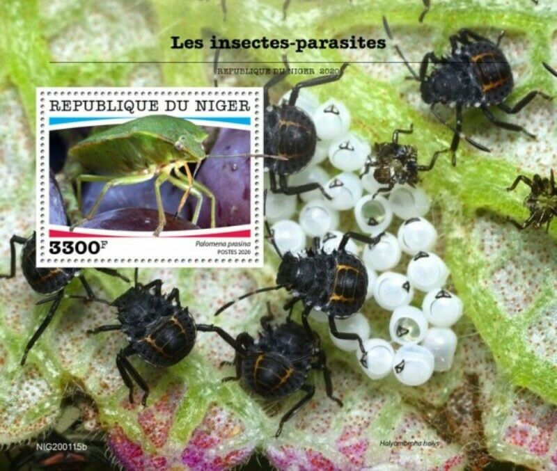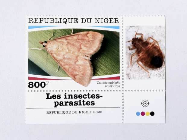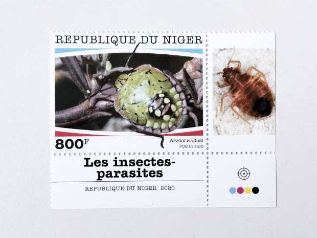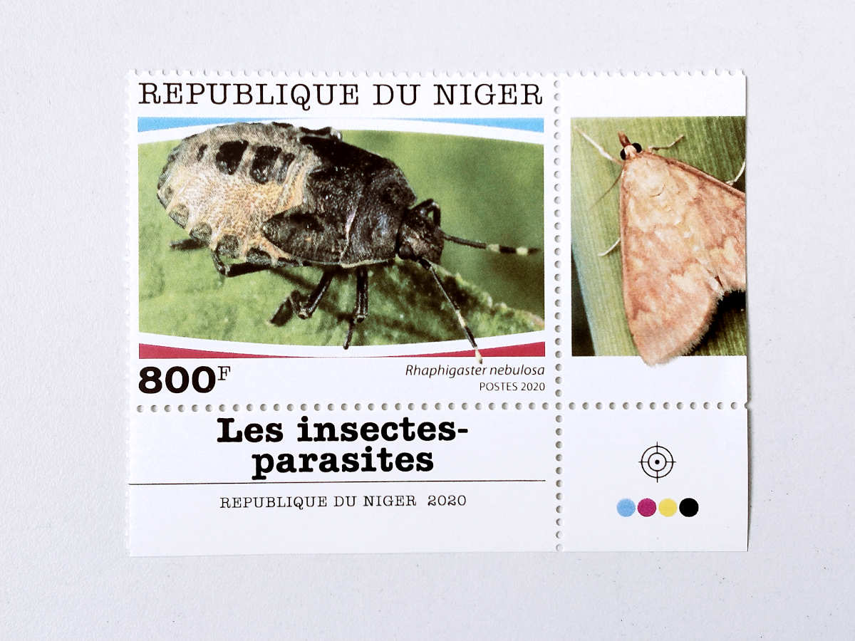 Este sello forma parte de la serie ‘Les insectes-parasites’ emitida por la República de Níger el pasado año 2020. Por lo que he averiguado, consta de por lo menos de cinco sellos. Yo adquirí cuatro que reproduzco en esta entrada. Y añado al final el que me falta, el cual está disponible en páginas de venta en internet. De los cinco sellos, cuatro están dedicados a heterópteros (Cimex lectularius, Rhaphigaster nebulosa, Nezara viridula y Palomena prasina) y uno lepidópteros (Ostrinia nubilalis). De estas cinco especies, cuatro son plagas del campo y una doméstica.