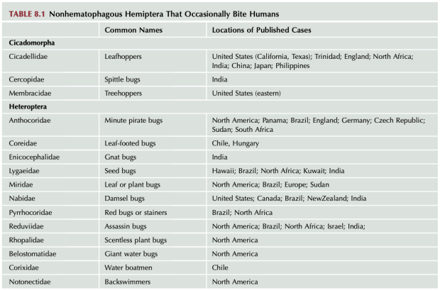 En la imagen número 3, se puede ver una tabla elaborada por Gary R. Mullen y Lance A. Durden y publicada en el libro ‘Medical and Veterinary Entomology’ de 2019 [5]. La tabla se recoge las familias de hemípteros que pueden picar ocasionalmente. En primer lugar aparecen tres familias de homópteros que hay que tener en cuenta si nos encontramos en un caso de picadura ocasional. En cuanto a los heterópteros, constan 12 familias de las que se han publicado casos por todo el mundo. Los autores destacan dos familias, Reduviidae y Anthocoridae, de las que se han reportado más casos.