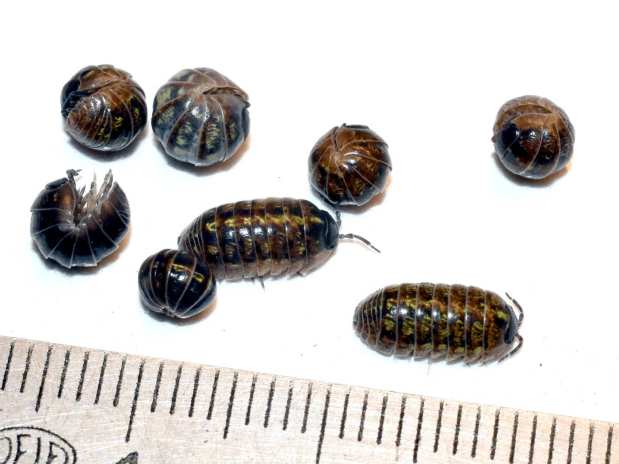 Una especie común de cochinilla de la humedad en la zona donde vivo es Armadillidium vulgare. Se la encuentra en zonas húmedas de parques y jardines. Los adultos miden 10 mm de largo por 5 mm de ancho [1]. Otra especie común de este género es Armadillidium granulatum [2]. Los adultos son de mayor tamaño llegando hasta los 20 mm de longitud. Ambas especies presentan volvación, es decir, que tienen capacidad de enrollarse sobre sí. Esto los separa de otras cochinillas comunes donde vivo como las del género Porcellio laevis y Porcellionides pruinosus.