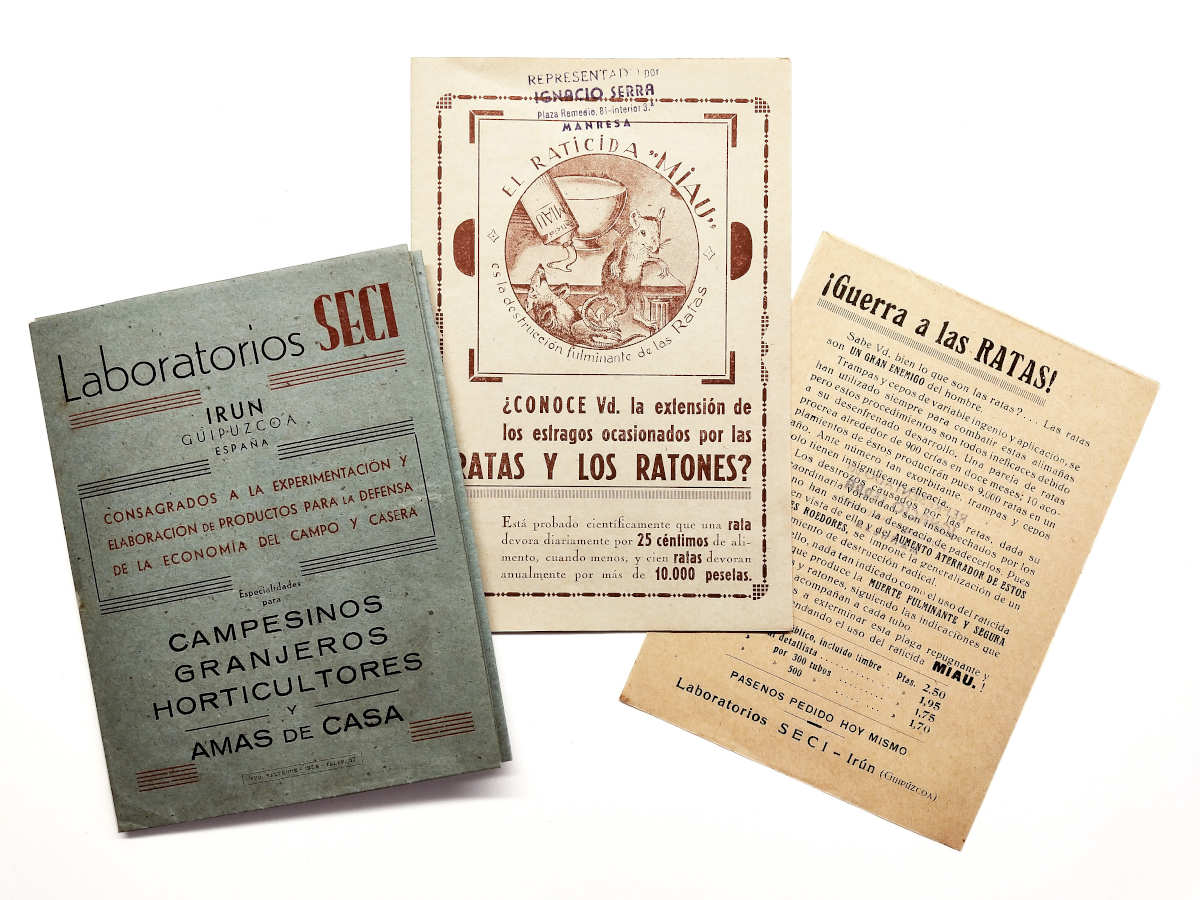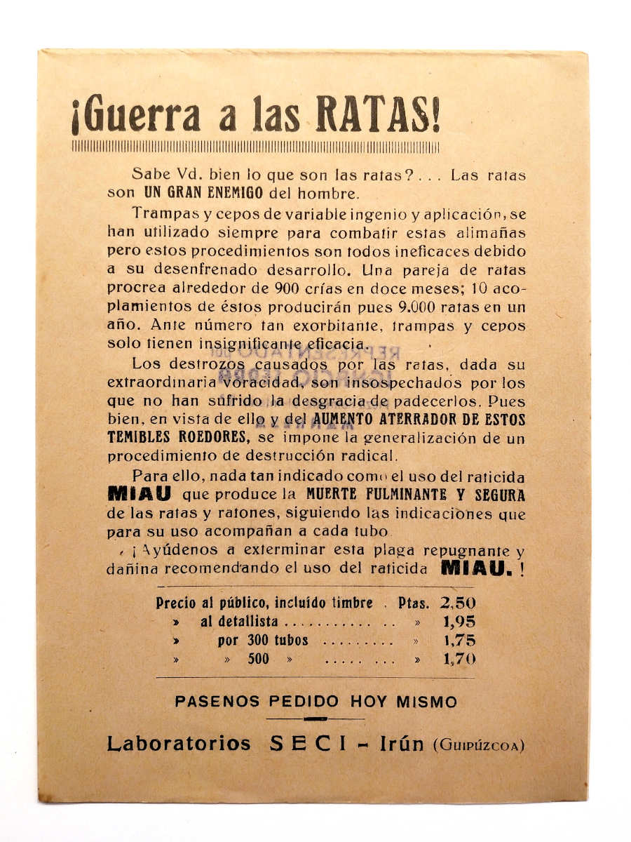 He hecho acopio de documentación impresa sobre el Raticida Miau (figura 1). Este producto de simpático nombre fue comercializado por Laboratorios SECI de Irún. Esta documentación consta de un díptico publicitario a cuatro caras con información sobre su uso (figuras 3-4), un folleto publicitario a una cara con una lista de precios (figuras 5-6) y un desplegable con preparados de esta casa comercial (figuras 7-12). Los dos primeros documentos llevan un sello del representante para la zona de Manresa: Ignacio Serra con local en plaza del Remedio, 81, interior 3a.