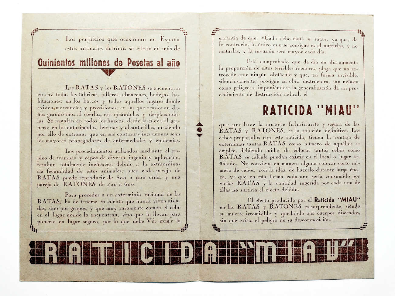 Respecto al Raticida Miau, se vendía en tubos metálicos al precio de 2,50 pesetas. El formulado consistía en una pasta alimenticia muy atrayentes para preparar cebos. Como otros productos de la época, se untaban trozos de pan con la pasta y se aplicaban en la zona de paso de ratas y ratones. En la documentación no consta qué materia activa contenía. Ahora bien, es probable que esta fuera fósforo (P) o fosfuro de zinc (P2Zn3). Por la presentación en tubos para dispensar y por la manera de aplicarse, me parece un producto parecido a la Pasta fosfórea de L. Steiner [1] o al Matarratas Nogat [2].
