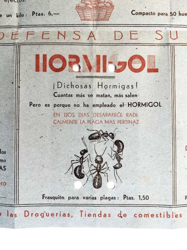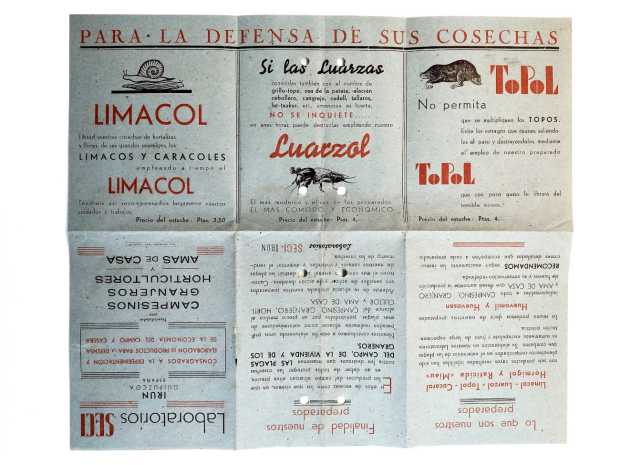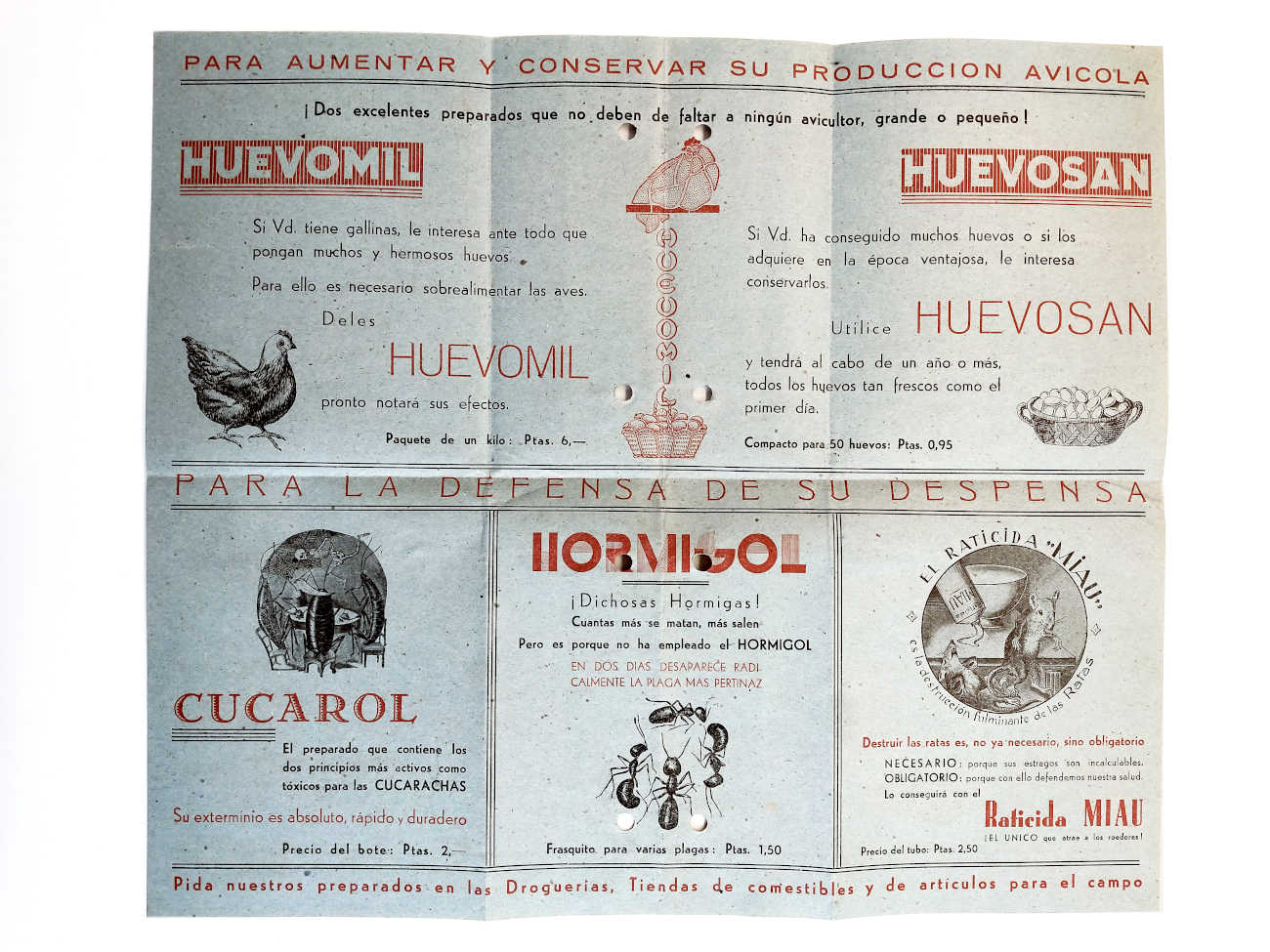 Desconocía la existencia del Raticida Miau hasta que encontré estos documentos. Sin embargo, no fue el único plaguicida comercializado por Laboratorios SECI. Como se puede ver en el desplegable, también tenía en su catálogo Limacol (contra limacos y caracoles), Luarzol (contra el alacrán cebollero), Topol (contra topos), Cucarol (contra cucarachas) y Hormigol (contra hormigas). Y además tenía dos interesantes preparados para aumentar y conservar la producción avícola. Por un lado, tenía Huevomil para que las gallinas «pongan muchos y hermosos huevos» y, por otro, Huevosan que permitía conservar los «huevos tan frescos como el primer día» un año o más.