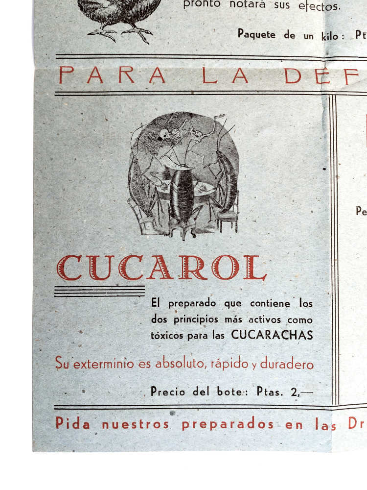 Esta documentación es de principios de la década de 1940. En el desplegable aparece un párrafo que describe la miseria vivida en años posteriores a la Guerra Civil: «En años de escasez como los que vivimos, en que los productos del campo alcanzan altos precios, es un deber de todos proteger las cosechas contra los destrozos que ocasionas las plagas del campo, de la vivienda y de los graneros». De hecho, los únicos anuncios que he encontrado sobre los preparados de Laboratorios SECI pertenecen a Cucarol y fueron publicados entre 1941 y 1942 en el periódico ‘El Faro’ de Ceuta (figura 2).
