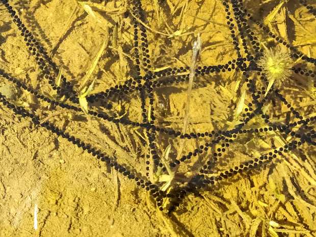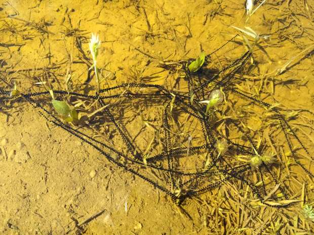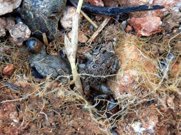 Addenda. El 4 de mayo regresé al descampado (figuras 8-9) y encontré un sapo corredor (Bufo calamita) muerto en un charco (figura 10). Pero también renacuajos (figura 11) y puestas (figuras 12-13).