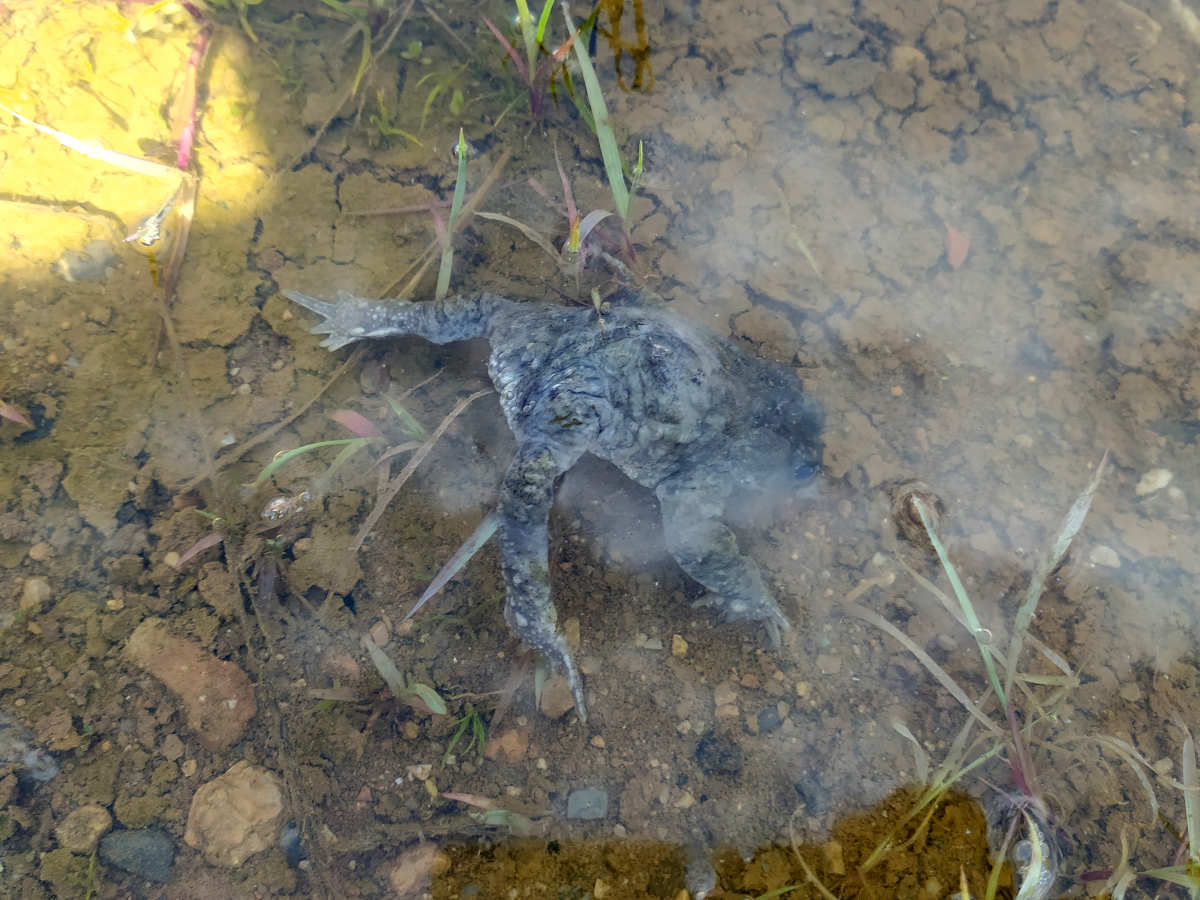 Addenda. El 4 de mayo regresé al descampado (figuras 8-9) y encontré un sapo corredor (Bufo calamita) muerto en un charco (figura 10). Pero también renacuajos (figura 11) y puestas (figuras 12-13).