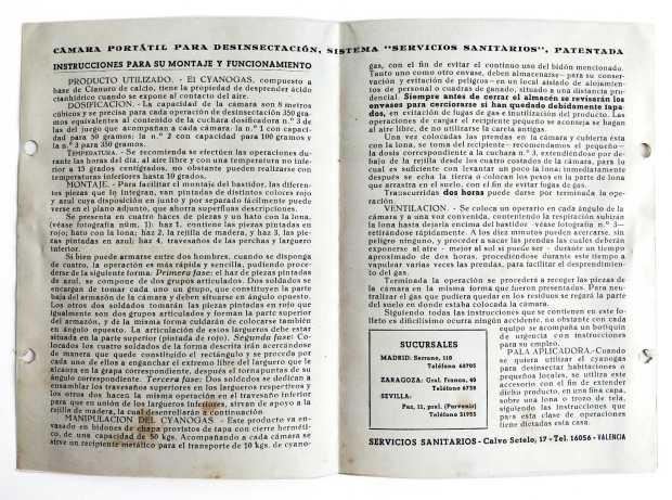 La Guerra Civil afectó al funcionamiento de Fumigaciones Sanitarias y de Fumigadores Químicos. Sin embargo, la segunda tenía un negocio sólido con el tratamiento de los frutales. De hecho, Fumigadores Químicos era en su época la única empresa que servía ácido cianhídrico líquido que fabricaba en Valencia. Por tanto, había una disponibilidad de producto para realizar aplicaciones sanitarias. Para saber algo más sobre este asunto, habría que poder leer las patentes. Esto permitiría saber el nombre del inventor y a qué empresa estaba asignada. Pero he hecho intentos infructuosos de localizarlas.