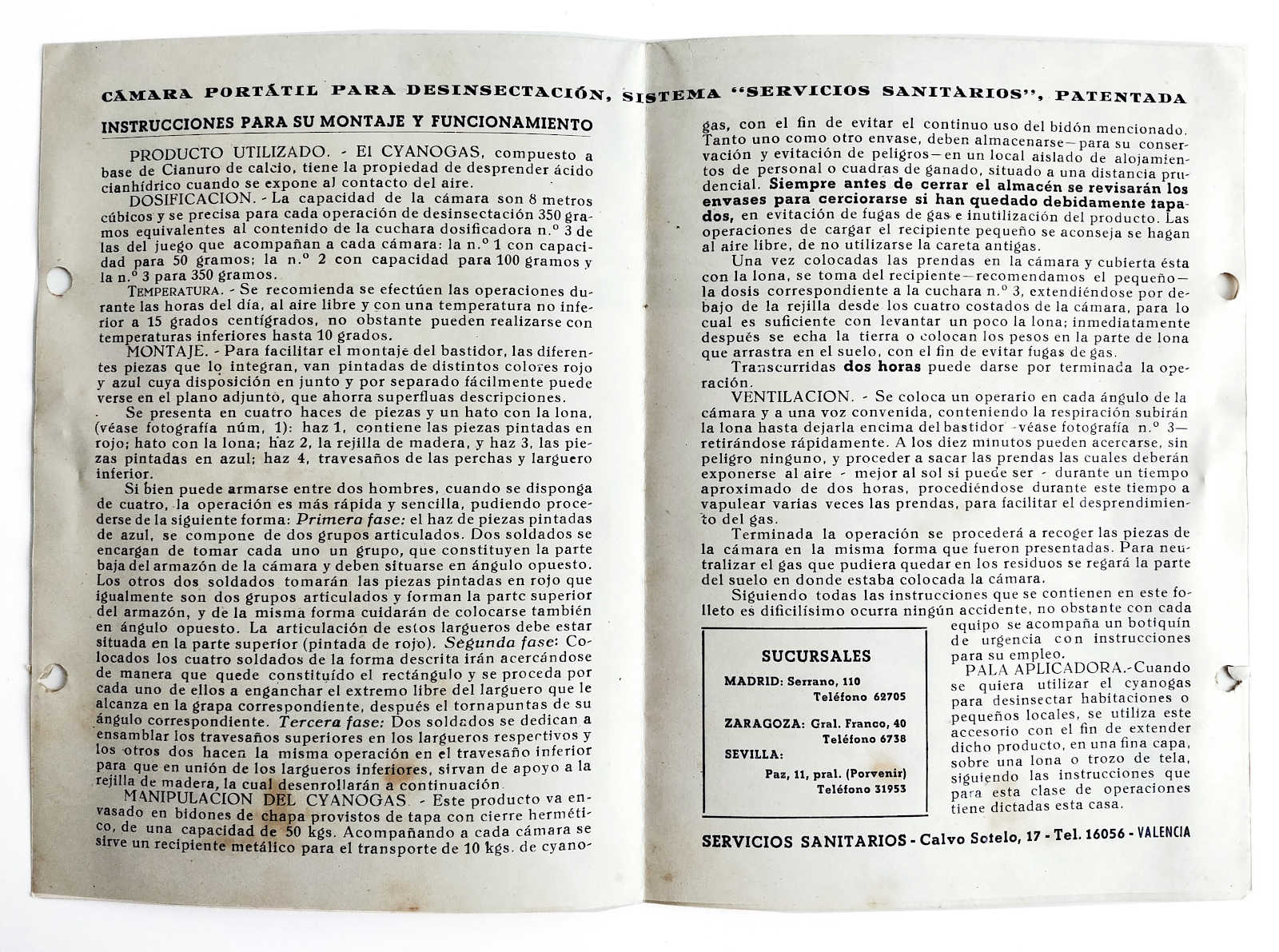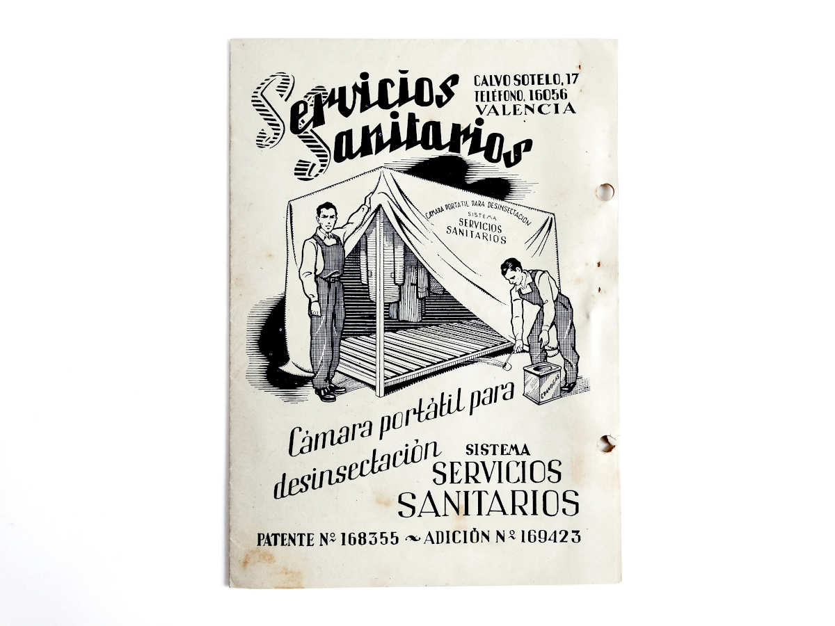 Como se puede ver en las imágenes, la cámara portátil es comercializada por Servicios Sanitarios de Valencia. Consta como diseño protegido por dos patentes, 168355 y 169423. No he encontrado información alguna sobre una empresa de desinfección con esta denominación. Respecto a la datación, este folleto debió de ser publicado en torno a 1940.