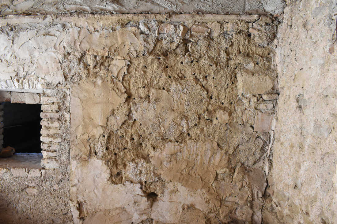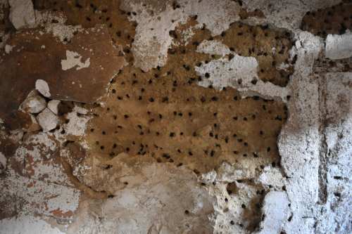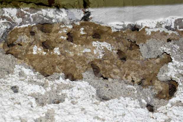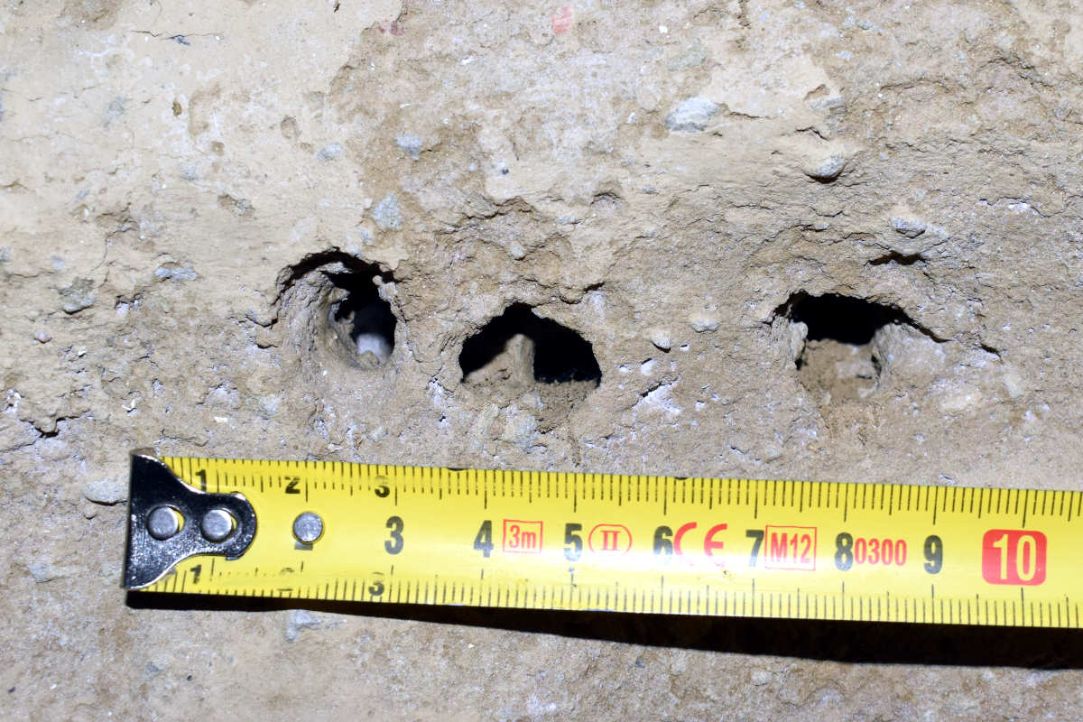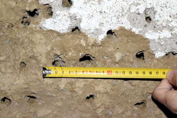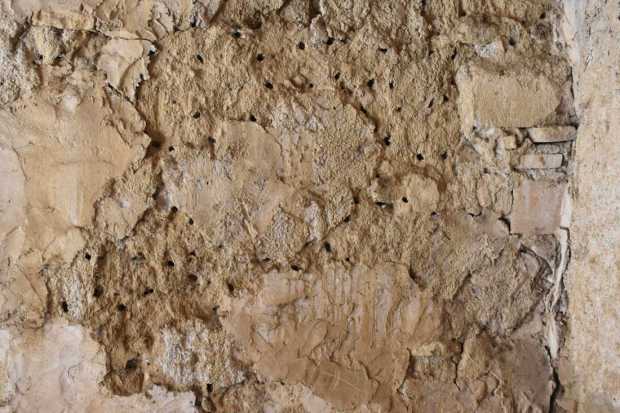 El pasado mes de marzo tuve la oportunidad de ver un caso interesante en Roda de Ter. Un conocido de esta población de Osona me comentó que tenía una pared de barro donde anidaban abejas. Me explicó que junto a la vivienda había un viejo almacén al que no daba uso. Sin embargo, se encontraba lleno de abejas durante la primavera. Me preguntaba si los agujeros que las abejas practicaban podían afectar a la estabilidad de la pared. Yo no entendía que unas cuantas abejas pudieran suponer un problema estructural. Pero esta persona me dijo que eran muchas. Entonces le pedí si podía tomar una fotografía y enviármela. Y en efecto, vi que la pared se encontraba llena de agujeros (figura 1 y 2).