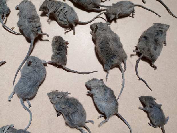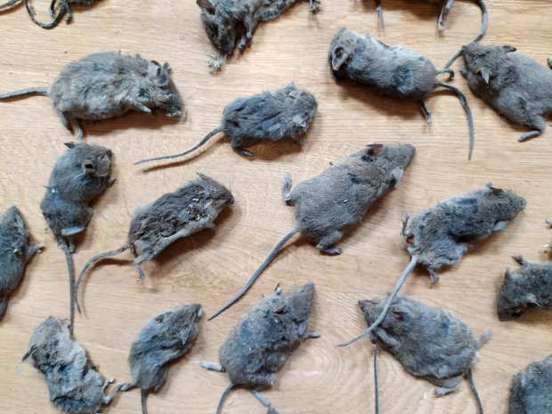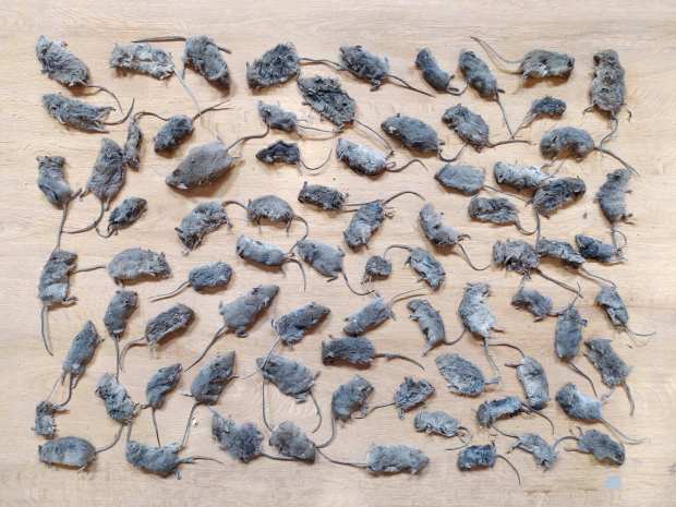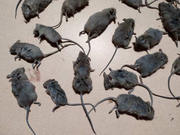 En las imágenes 2 a 6, se pueden ver algunos de los ratones que recogimos al poco de haber realizado la primera aplicación. Y en las imágenes 9 a 12, se pueden ver los que encontramos cuando llegamos al mes siguiente para realizar la segunda aplicación. Entonces, vimos que la situación había cambiado totalmente y no vimos más que algún ratón en una zona remota en la que había todavía algo de grano y que se nos pasó por alto en la primera visita. Me considero una persona sistemática, pero por experiencia he visto que se tarda tiempo en conocer las instalaciones de un cliente. Por lo general, vamos con el tiempo justo para realizar los servicios.