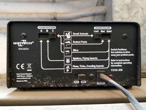 Como anécdota explico que el cliente había instalado un aparato de ultrasonidos para ahuyentar a los ratones. En las imágenes 7 y 8 se puede ver el aparato. No tiene desperdicio la parte posterior donde unos botones permiten escoger la frecuencia y el volumen. Parece que el aparato dispone de varias frecuencias para ahuyentar tres clases de animales: (1) ratas, ratones y otros pequeños animales como ardillas; (2) arañas e insectos voladores; (3) pulgas, garrapatas e insectos rastreros. Dejo anotado que cuando estuvimos realizando la primera aplicación se oía un sonido muy alto y desagradable que parecía una alarma. No sabíamos qué era hasta que nos acercamos al aparato. Entonces decidí desconectarlo de la corriente porque provocaba dolor de cabeza. Desconozco su eficacia, pero dudo que ahuyentara a los ratones.