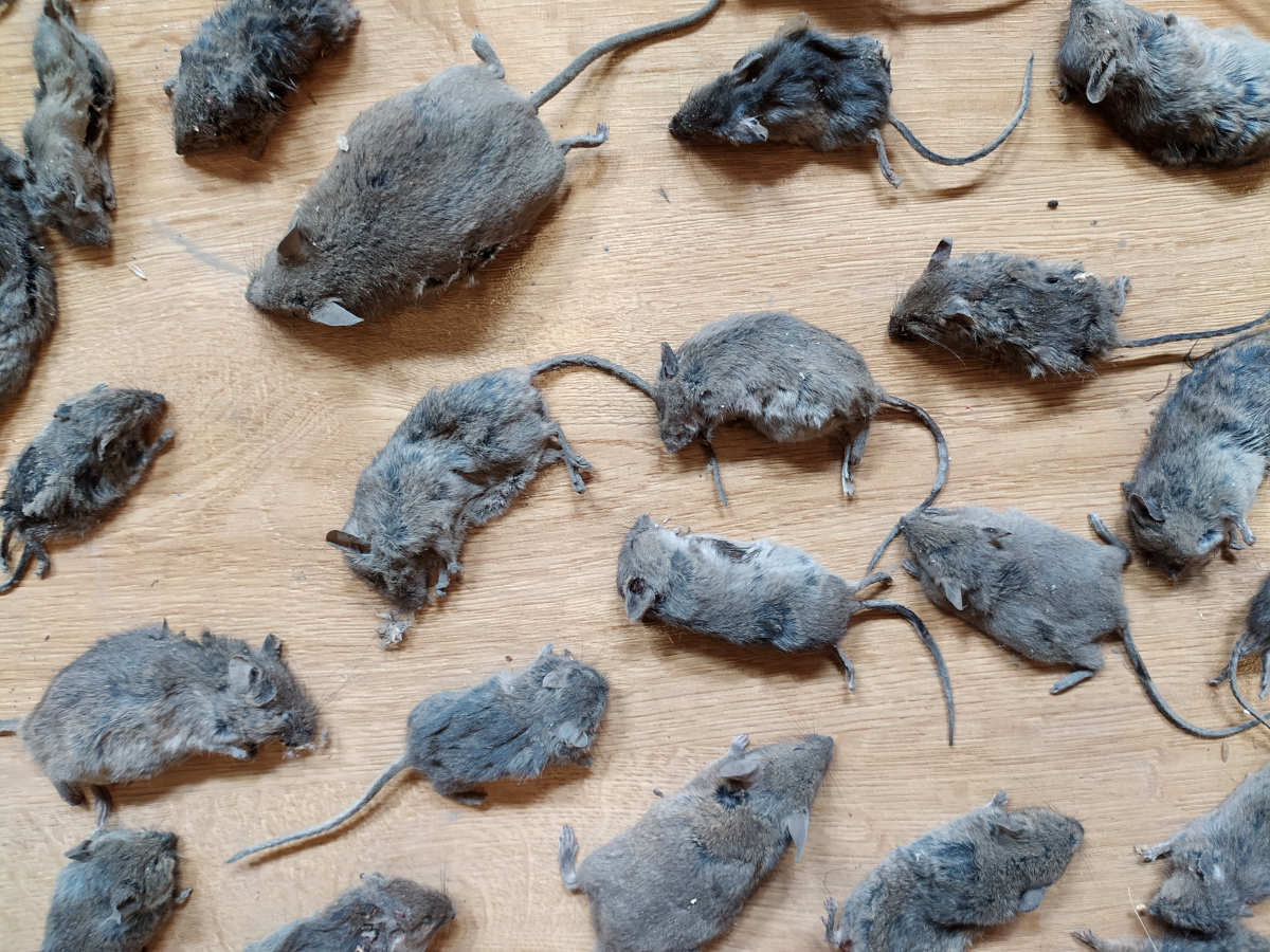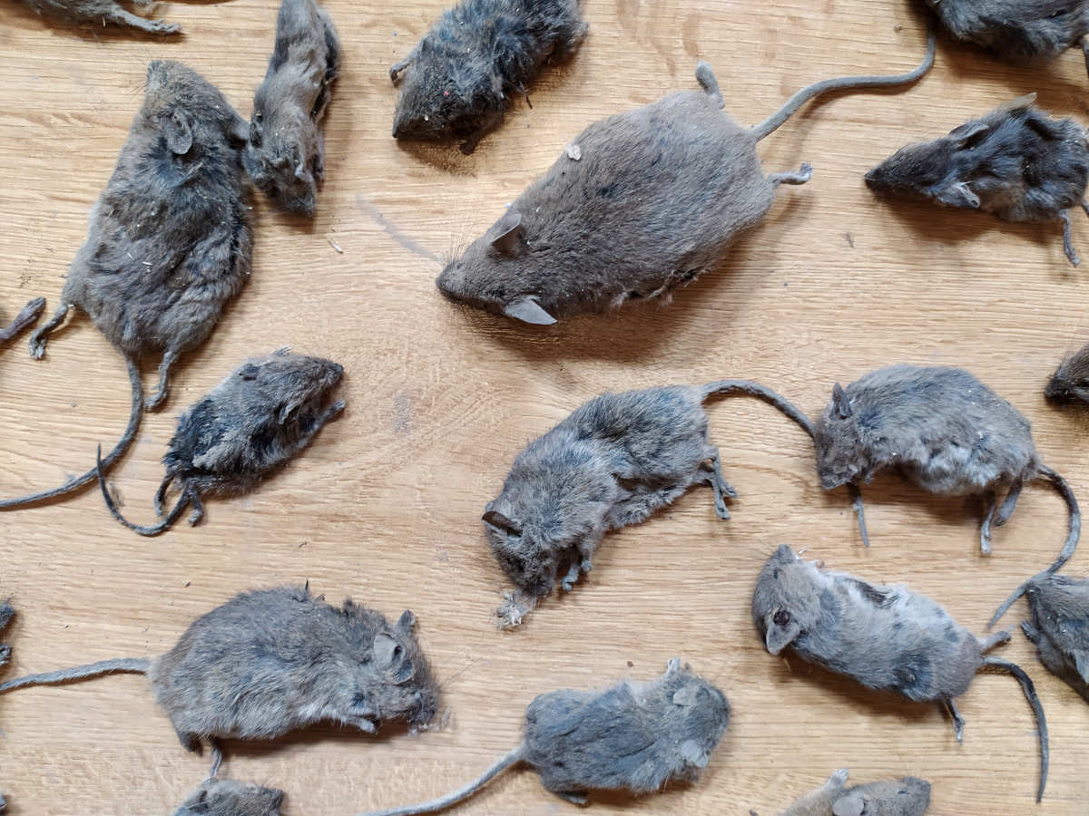 En las imágenes 2 a 6, se pueden ver algunos de los ratones que recogimos al poco de haber realizado la primera aplicación. Y en las imágenes 9 a 12, se pueden ver los que encontramos cuando llegamos al mes siguiente para realizar la segunda aplicación. Entonces, vimos que la situación había cambiado totalmente y no vimos más que algún ratón en una zona remota en la que había todavía algo de grano y que se nos pasó por alto en la primera visita. Me considero una persona sistemática, pero por experiencia he visto que se tarda tiempo en conocer las instalaciones de un cliente. Por lo general, vamos con el tiempo justo para realizar los servicios.