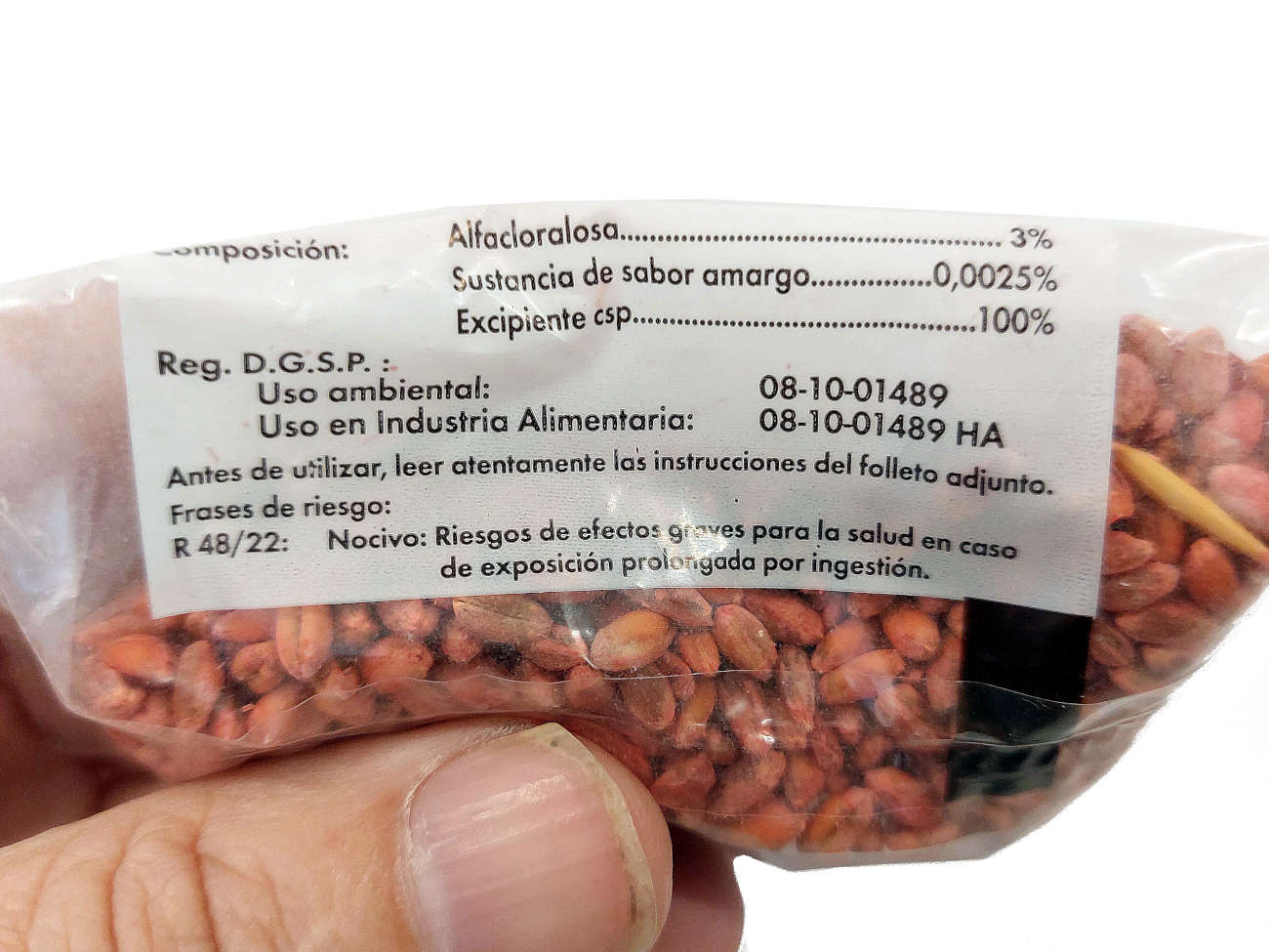 El vecino me explicó cómo había elaborado los cebos. Y me dijo que se le había acabado cuando mostré interés en ver el envase. Entonces me dijo que lo tenía aún y me lo dio. Como se puede ver en las imágenes, es un envase pequeño. El contenido son 20 gramos de polvo azul con alfacloralosa al 40%. Para evitar peligros, también contiene benzoato de denatonio al 0,0025%, sustancia de sabor amarga que impide la ingesta accidental por parte de personas. En el envase consta el número 04-10-01567(-HA) del Registro de Plaguicidas no Agrícolas del Ministerio de Sanidad.