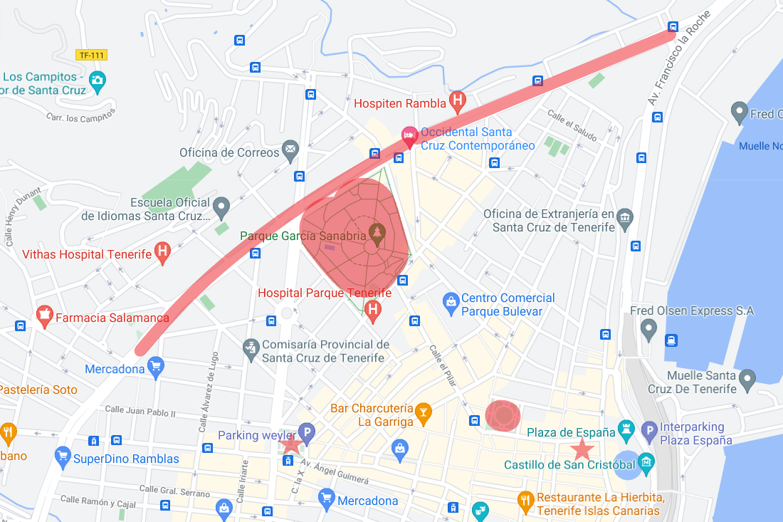 Hace un par de semanas pasé unos días en Santa Cruz de Tenerife. Aproveché los ratos que tenía libre para buscar insectos urbanos. Me interesan hormigas y cucarachas. En el primer paseo que di por la ciudad, descubrí la rambla de Santa Cruz. Es una vía ancha que tiene en el centro un bonito paseo que se encuentra flanqueada por jardineras con arbustos y árboles (figura 1). Al ver las plantas, pensé en buscar hormigas. Así que al día siguiente por la tarde, poco antes de la puesta, me puse a identificar y recoger hormigas.