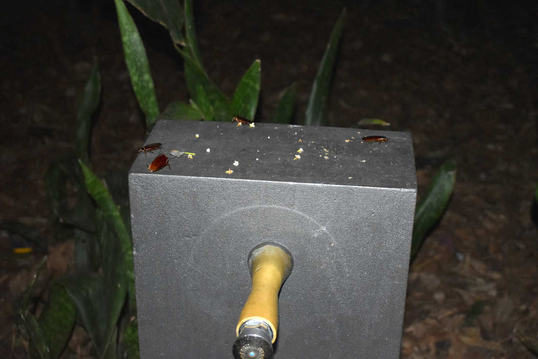 Vista la ninfa, pensé que cuando oscureciera, no tardarían mucho en aparecer. Entonces saqué mi cámara réflex y me puse a la espera. Y en media hora empezaron a aparecer por la jardinera. Salían hambrientas en busca de un bocado. Vi que muchas trepaban a las plantas y se alimentaban sobre las hojas (figs 3-11). Me acerqué y vi lo que parecían ser secreciones de áfidos y cóccidos que debían caer de los árboles. Esto se puede ver de una manera clara en el vídeo número 1. En el suelo de la jardinera, las cucarachas campaban a gusto alimentándose de frutos, excrementos o lo que encontraran (figs 12-18). En el vídeo número 2, se puede ver cucaracha americana (Periplaneta americana), también presente en la zona. Sin embargo, era excepción ante la gran cantidad de cucaracha australiana.