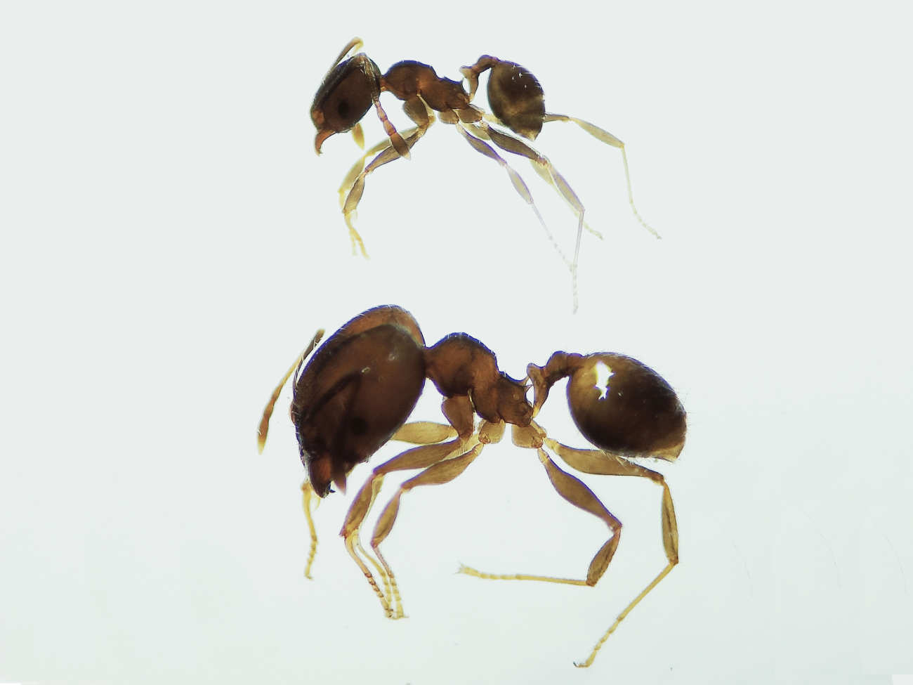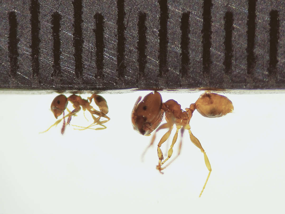 Como se puede ver en la tabla (figura 4), P. bilimeki es una de las especie más pequeñas. En la imagen número 3, muestro una obrera minor y una mayor. La minor mide cerca de 1’5 mm y, la mayor, cerca de 2’5 mm. La colonia está formada por una sola reina (monoginia), pero puede ocupar varios espacios independientes (polidomia). Esto lo constaté al ver que accedían por grietas y agujeros alejados unos de otros. El número de individuos es alto, entre los 600 y los 4.000. La sensación que tuve es de una colonia numerosa. Vi muchas obreras.