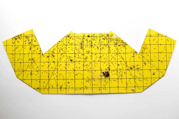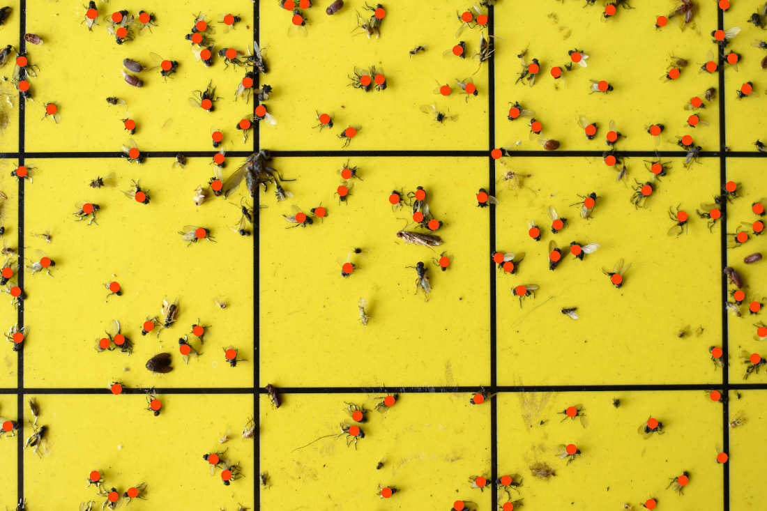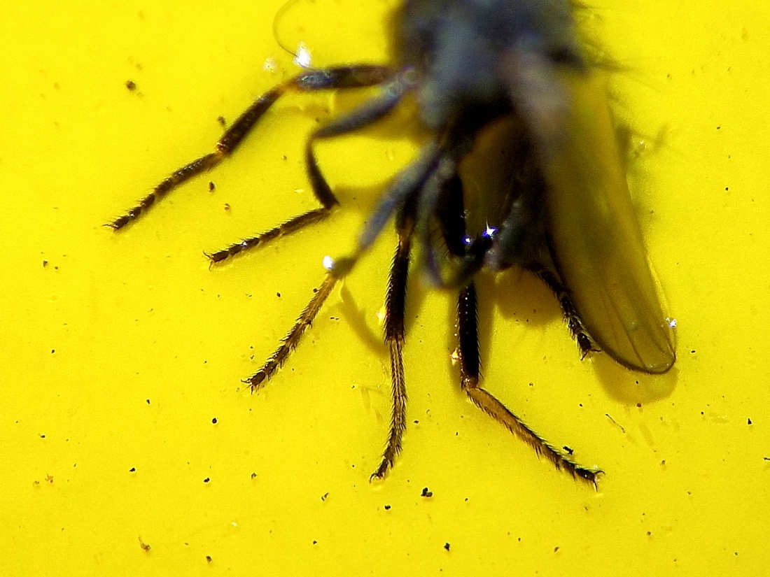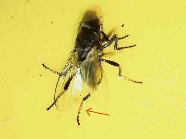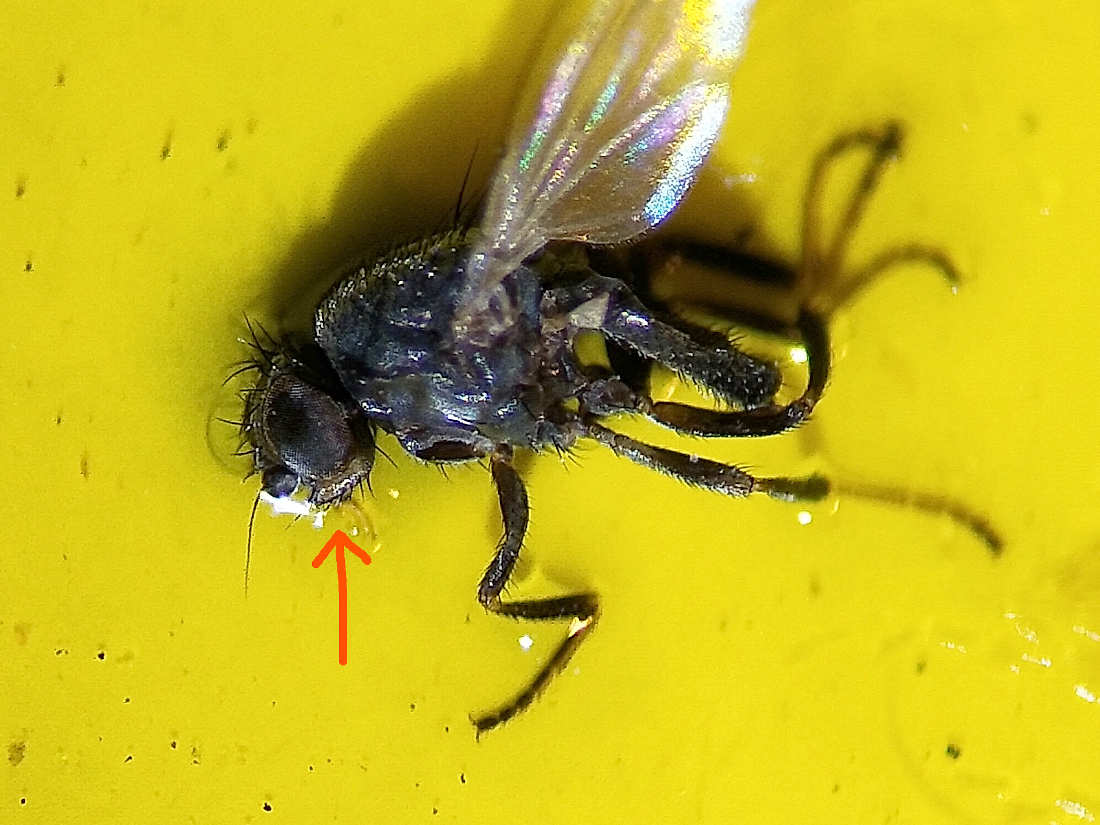 Por suerte, Adrià Miralles, biólogo en Servicios Depec, me ha ayudado a deshacer este equívoco. Así que he estado un tiempo mirando láminas adhesivas que tengo en la zona portuaria de Barcelona y he podido constatar que D. varipalpis es común. De hecho, en algunas zonas es más común y puede llegar a ser la especie más capturada. En la imagen número 1, se puede ver una lámina adhesiva de aparato Fly Nice de Sanitrade en la que D. varipalpis es la más abundante. En la imagen número 2, muestro detalle de la lámina donde indico mediante puntos naranjas los individuos de esta especie.