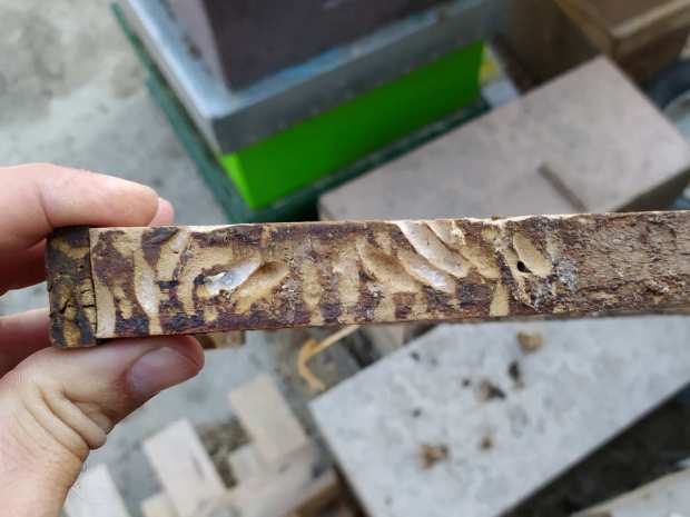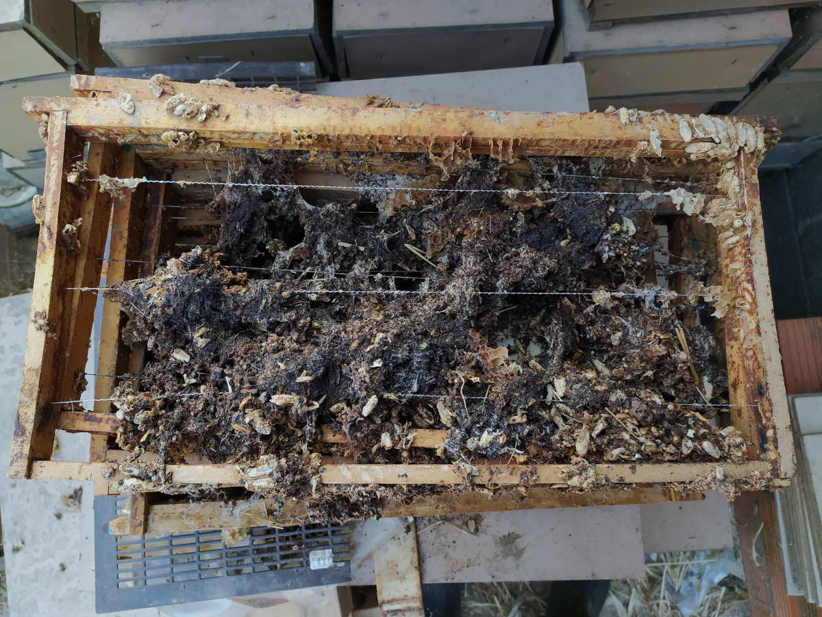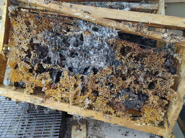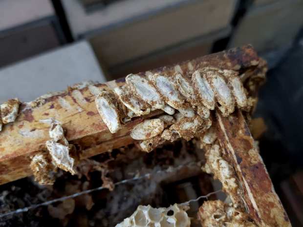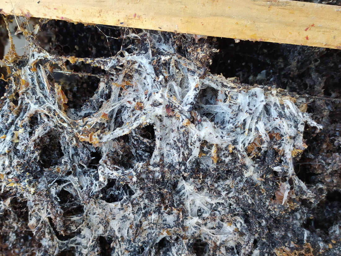 En un cliente encontré unos cuadros de colmena Langstroth afectados por polillas de la cera (figura 1). Anduve observando los severos daños que estas polillas causan en los panales de la abeja de la miel (Apis mellifera). Se utiliza el término galeriosis para referirse a los estragos que provocan las larvas de dos especies de pirálido (Pyralidae). Por un lado tenemos Galleria mellonella, conocida coloquialmente como polilla mayor de la cera o falsa tiña. Y por otro, Achroia grisella, de menor tamaño, conocida como polilla menor de la cera o verdadera tiña.