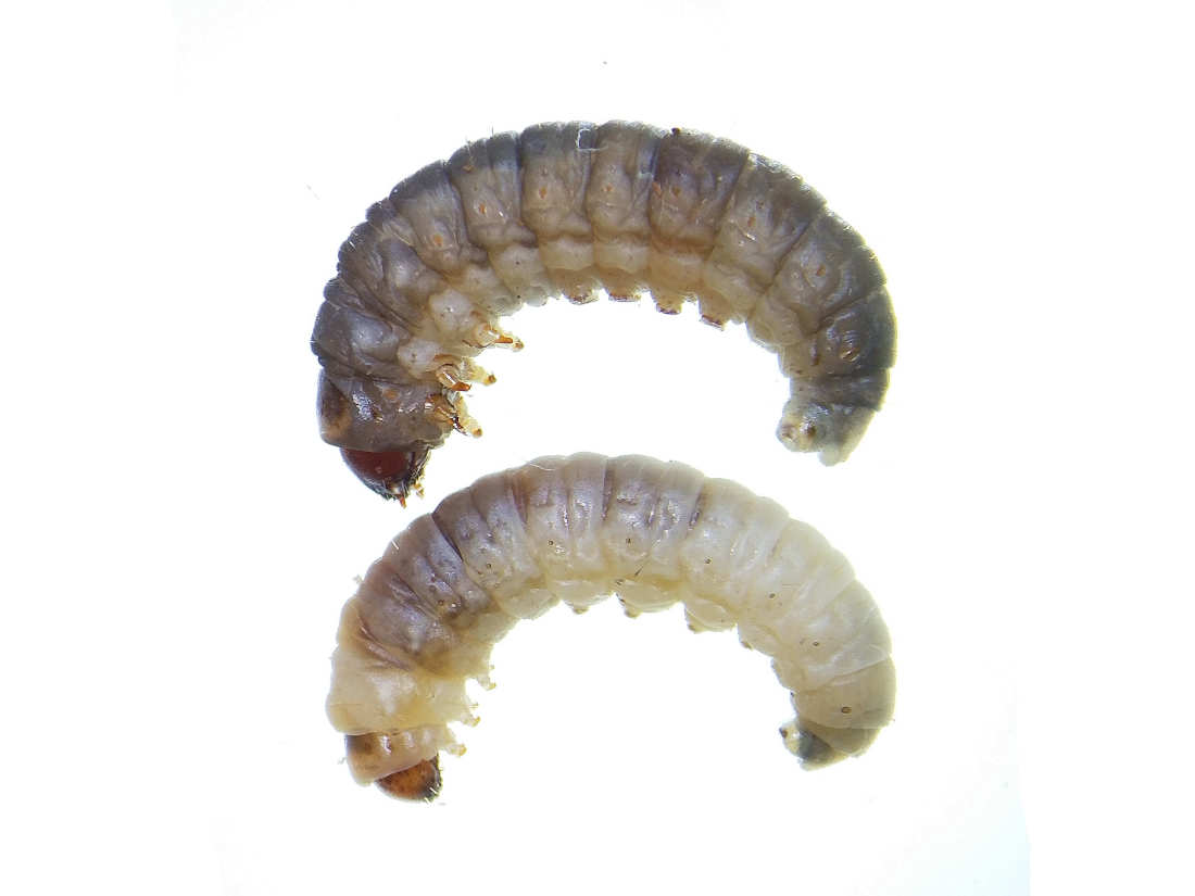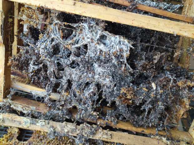 Las larvas se alimentan principalmente de cera, pero también de polen, restos de miel y mudas de larvas de abeja. Cavan túneles en los que van dejando sedas y excrementos que dan un aspecto gris y enmarañado como apolillado (figuras 1, 13-14). Pero además, tienen un potente aparato masticador que les vale para horadar la madera de los cuadros donde fijan un capullo duro (figuras 8-12). No atacan a los adultos de abeja. Solo dañan los cuadros móviles en los que hay cera. Son un serio problema en los cuadros almacenados, que es lo que yo pude ver.
