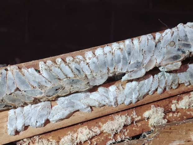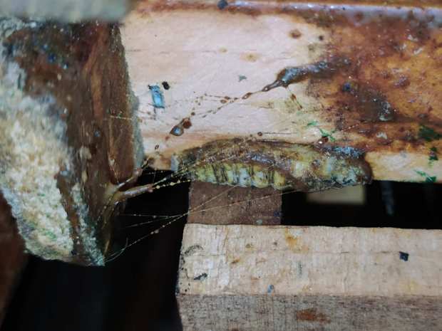 Al inspeccionar los cuadros, vi correr sobre las partes apolilladas unas polillas de aspecto plateado. Iban aceleradas y huían de la luz para esconderse. También vi larvas. Entonces decidí recoger una muestra para saber de qué especie se trataba, ya que las dos especies producen daños parecidos. Esto fue a mediados del pasado mes de mayo. Y hace unas semanas decidí mirar la muestra y tomar fotografías para dar cuenta de la especie encontrada. Pues bien, en la muestra aparecieron solo adultos de Achroia grisella.