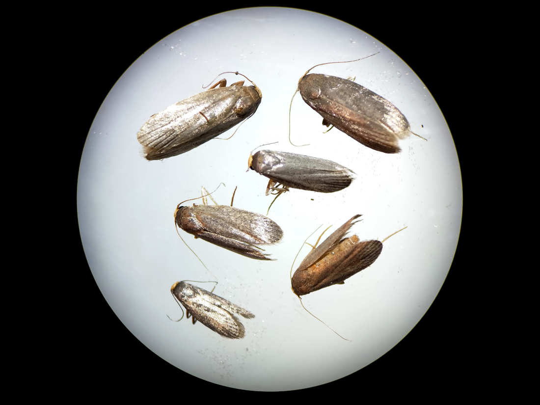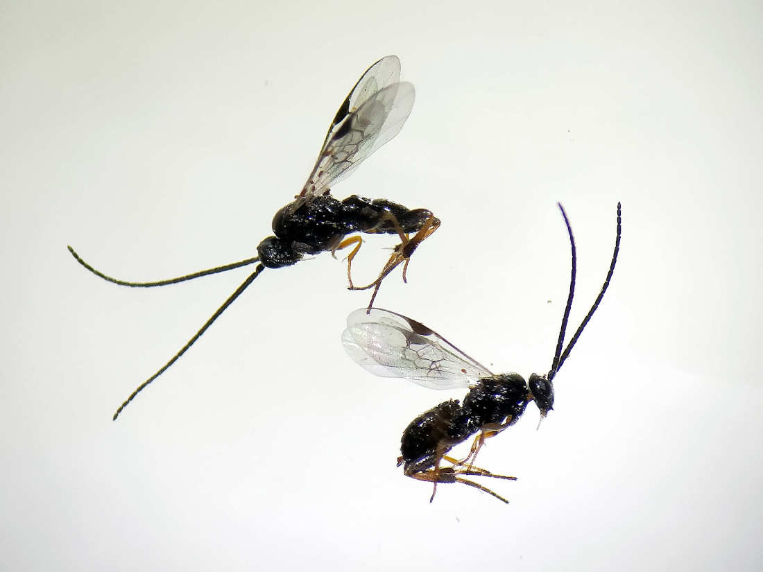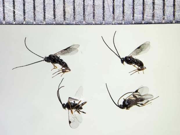 Ahora bien, además de aparecer adultos de la verdadera tiña, aparecieron avispas parasitoides de la familia Braconidae. Esto em pareció más interesante que la propia polilla. En las imágenes 6 y 7 se pueden ver cuatro adultos de lo que parece Apanteles galleriae. Por el aspecto, parecen del género Apanteles. Sin embargo, discernir entre las diferentes especies de este género es cosa de especialista. Pero teniendo en cuenta que solo se menciona en la literatura científica esta especie de bracónido, lo dejo en A. galleriae. También es parasitoide de Galleria mellonella.