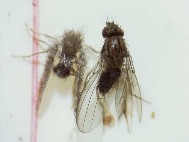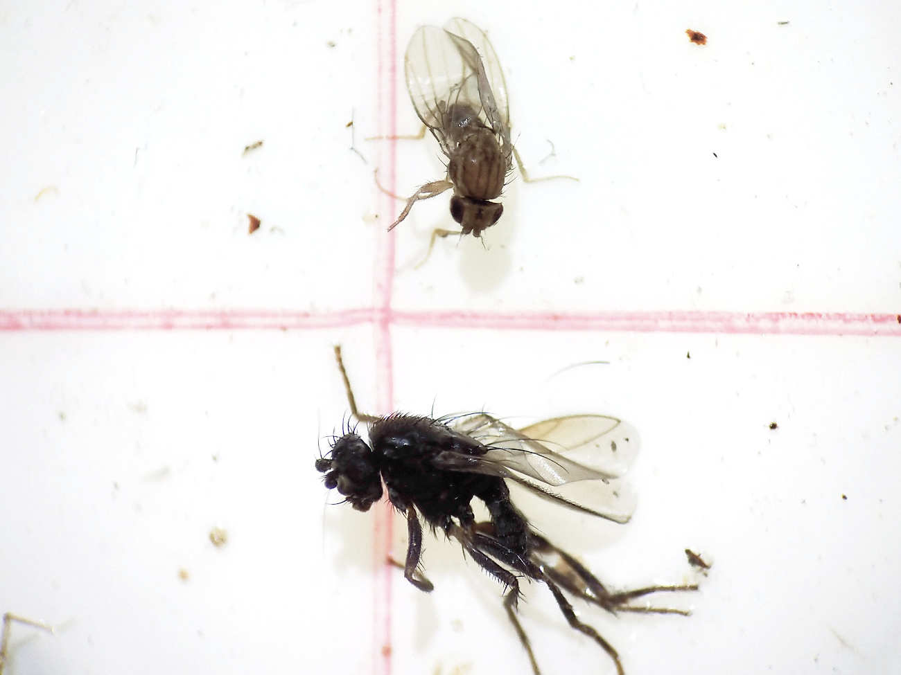 De las moscas Drosophila que pululan por nuestras casas, la menos abundante puede que sea Drosophila busckii. Y las más abundantes, dependiendo de las condiciones ambientales (termperatura, humedad) y del sustrato que haya (restos orgánicos), son D. repleta y D. melanogaster. Esto por lo menos, para la zona donde vivo, es decir, al noreste de la Península Ibérica. De hecho, no había prestado atención a D. busckii hasta que la he buscado en interiores en planchas adhesivas de aparatos de rayos UV y de trampas para insectos rastreros.
