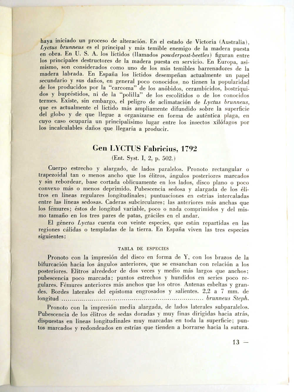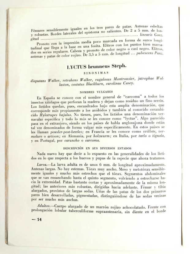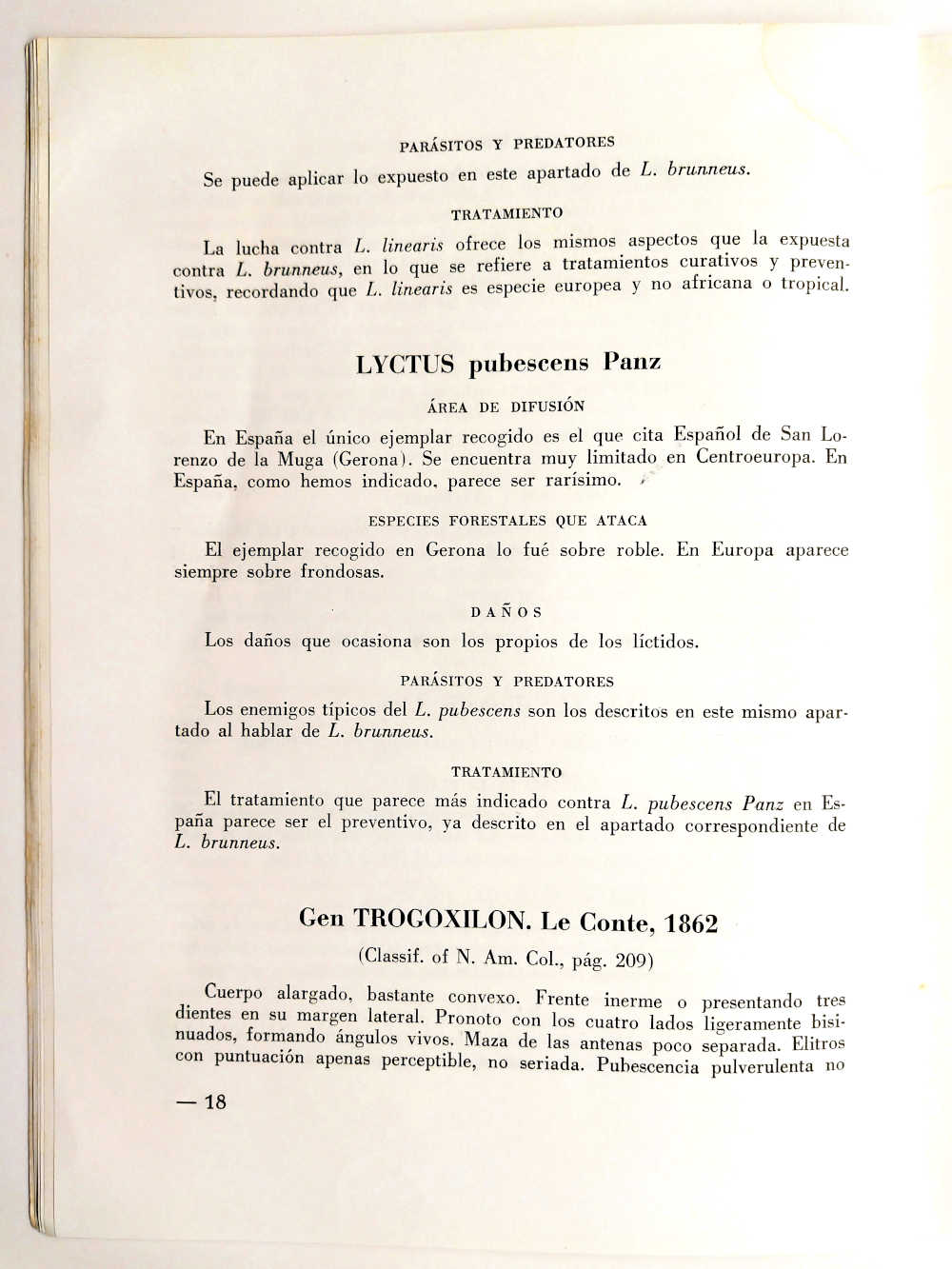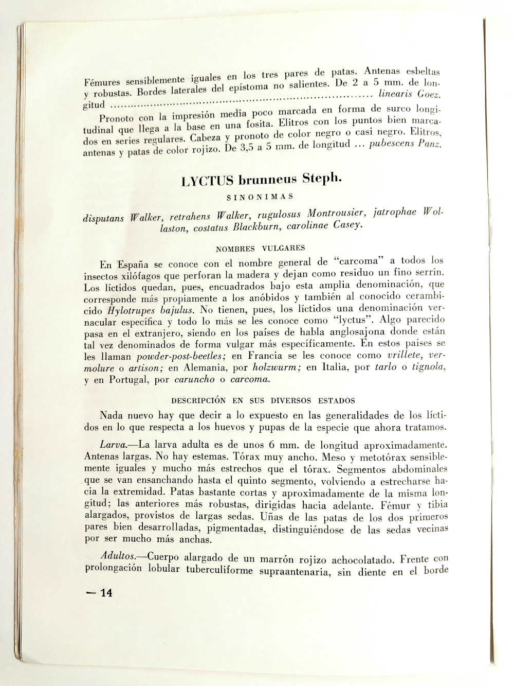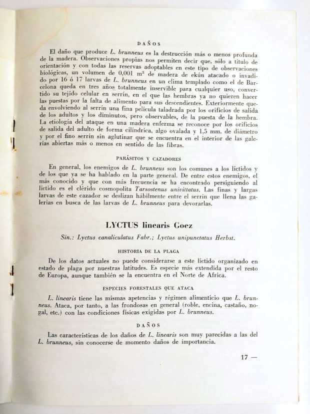 Respecto a Lyctus brunneus, es la que tiene un mayor impacto sobre la madera obrada. Es una especie de origen tropical que en aquella época tenía un impacto limitado si lo comparamos con el que tiene en la actualidad. Respecto a su distribución, escribe el autor: «[…] se localiza, principalmente, en los puertos de importación de productos tropicales y sus alrededores, focos que poco a poco se van introduciendo en el interior de la Península, transportados ya en maderas tropicales, ya en maderas del país, siendo entonces su localización más difusa, aunque centrándose principalmente en grandes centros urbanos buenos consumidores de madera» (pág. 15).