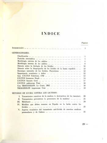 Para acabar, apuntar que el texto tiene una segunda parte dedicada a los métodos de lucha, tal y como se puede ver en el índice (figura 2). En aquella época, los tratamientos consistían en la aplicación de materias activas muy eficaces como lindano, dieldrín, pentaclorofenol, bicloruro de mercurio, ácido bórico, etc, ahora prohibidas.