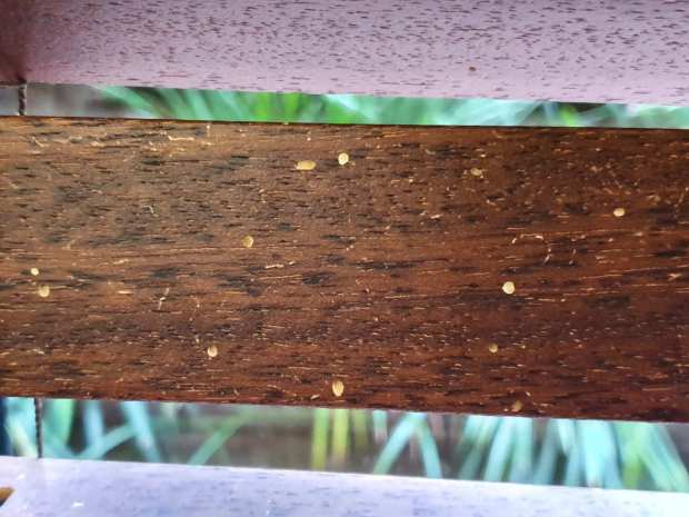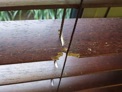 En este punto, me gustaría dejar nota que hace un par de años, en junio de 2019, Adrià Miralles, entomólogo en Servicios Depec, me explicó un caso que le llegó de infestación de Trogoxylon impressum. Un cliente tenía unas persianas de tipo celosía atacadas por un líctido que él identificó como de esta especie. En la figura número 3, se pueden ver dos fotografías que tomó de los adultos. No se pudo identificar la especie de madera de las persianas. En las imágenes 4-6 se pueden observar los daños. Pero aquí tenemos un caso. Habrá habido otros que no se habrán identificado correctamente, lo más probable.