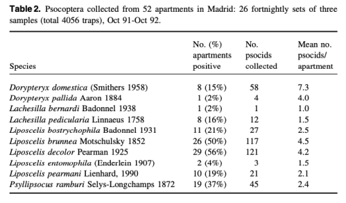 Lo dicho me hace pensar que Ectopsocus strauchi la podríamos considerar una especie doméstica solo cuando se producen unas condiciones ambientales adecuadas. Como sabemos, el orden de los psocópteros comprende insectos que se valen con poco y que prácticamente los podemos calificar de ubicuos. Muchas especies pueden vivir tanto alrededor de viviendas en exteriores (bajo hojas, bajo piso, muros, madrigueras, árboles, etc.) como en interiores. Requieren unos mínimos de humedad, pero encuentran alimento fácilmente. Por otra parte, es un orden del que falta mucho conocimiento a pesar de su presencia. En España, se publicó en 1999 un artículo francamente interesante en el que se realizó un muestreo en 52 apartamentos de Madrid [4]. En la imagen número 3, se puede ver reproducida la tabla que recoge las 10 especies encontradas.