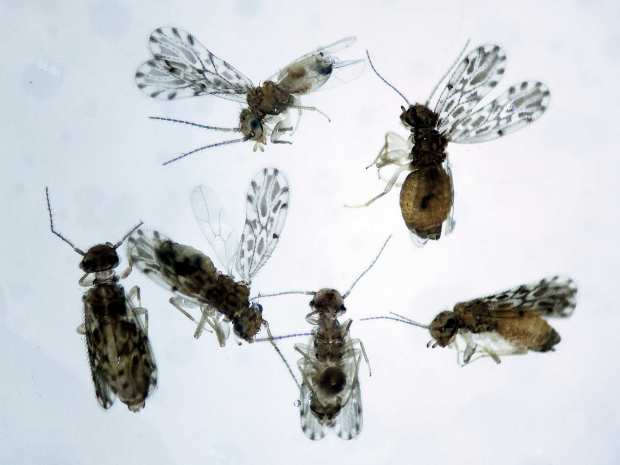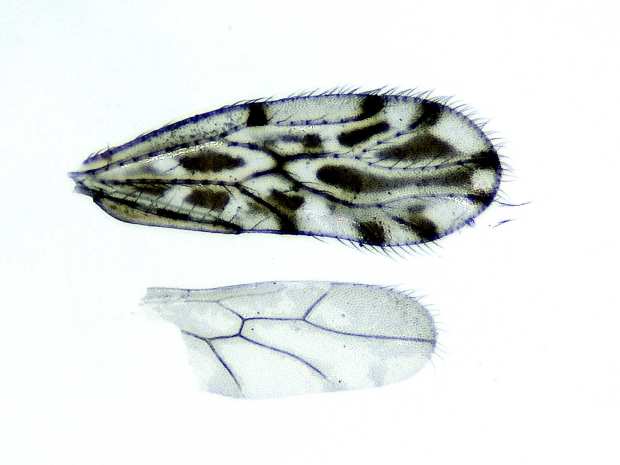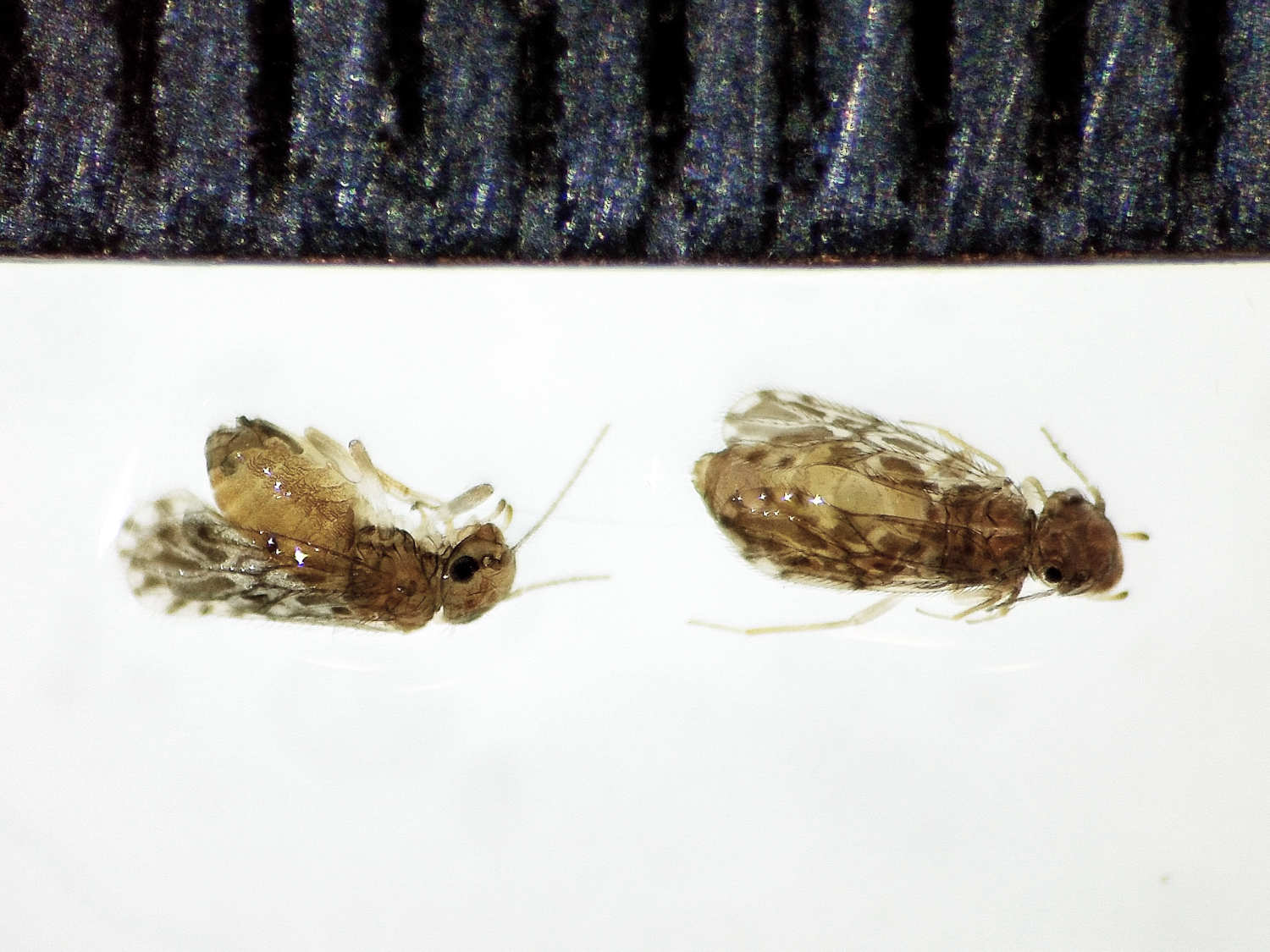 Vi que en ambos terrarios había psocópteros (Psocoptera), llamados de manera genérica piojos de los libros. Me entretuve en observarlos. Vi algo interesante, con la cucaracha del Turquestán había del género Liposcelis y, con la cucaracha argentina, había Ectopsocus. Miré unos cuantos con la lupa binocular y vi que se trataba de Ectopsocus strauchi (figura 1). Esta especie posee un ala delantera translúcida con manchas oscuras que la hace singular (figura 4). Los individuos medían poco más de 3 mm (figura 5).