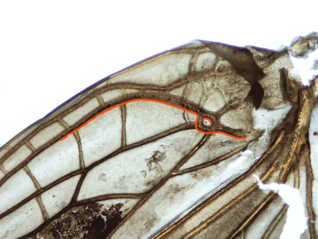 En primer lugar, la especie más fácil de identificar es G. africana, que es justo la que encontré en Carboneras. He ilustrado bien esta entrada con fotografías generales del ejemplar y algunas más de detalle. G. africana es la más pequeña. Los machos adultos no exceden de los 30 mm y las hembras de los 34 mm. En las otras especies que se encuentran en la Península Ibérica los adultos más pequeños pasan de los 35 mm [3]. El ejemplar de Carboneras es un macho de 27 mm. Se puede distinguir el macho de la hembra porque el macho tiene las tegminas y alas más largas. En la imagen número 12 se puede ver la tegmina izquierda por su parte exterior. Mide 11 mm de longitud aprox. Y en la imagen número 13, marco la fila estriduladora que se encuentra en la parte interior de la tegmina. G. africana se encuentra distribuida por el sur de la Península Ibérica, por toda África, Islas Canarias, Madagascar y Península Arábiga.