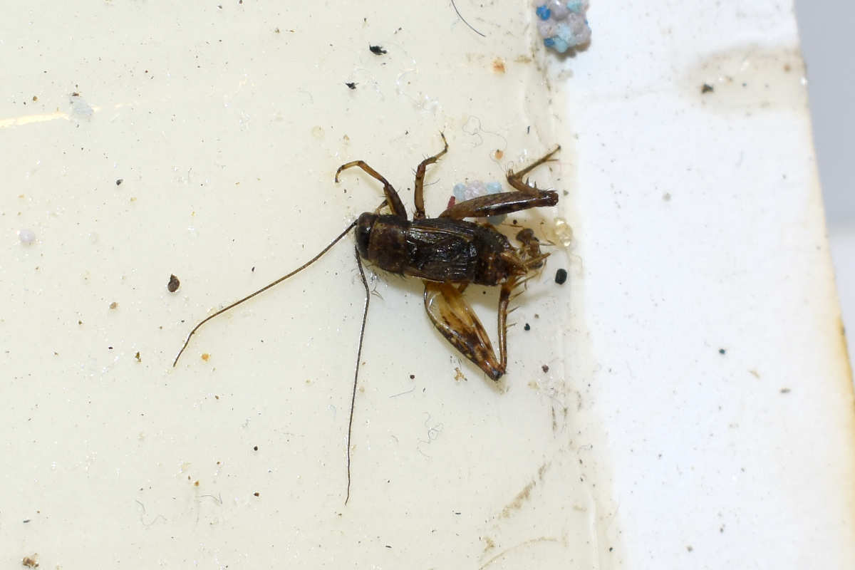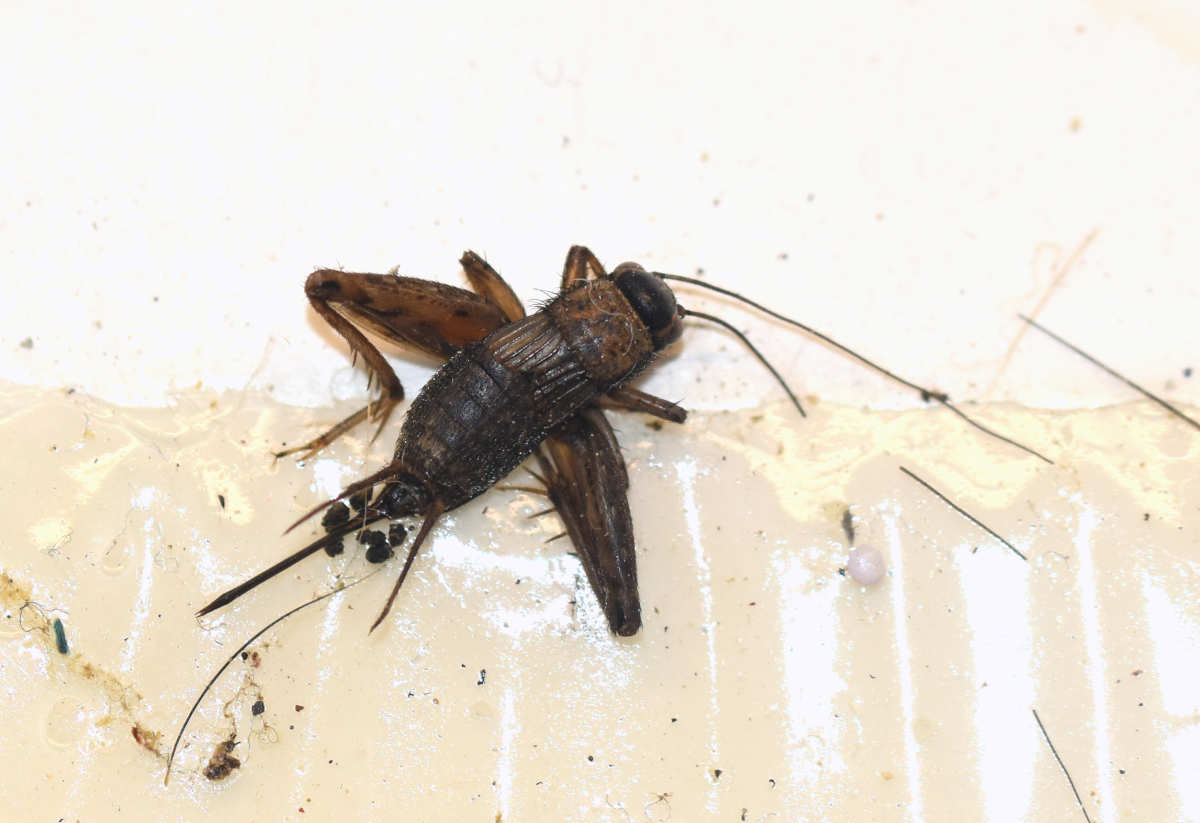 En la imagen número 1, se pueden ver tres adultos en una trampa adhesiva Trapper MC (Bell Laboratories). Son grillos de pequeño tamaño. Miden cerca de 10 mm de longitud. Son de color marrón oscuro. Las tegminas son cortas. En el macho llegan hasta la mitad del abdomen. Y en la hembra son más cortas. La cabeza es negra con un línea clara en forma de Y. En la imagen número 2, se puede ver una hembra. Destaca el largo oviscapto. En las imágenes 3 y 4, dos machos.