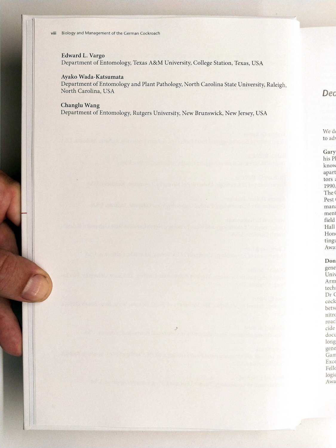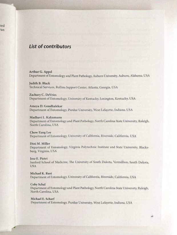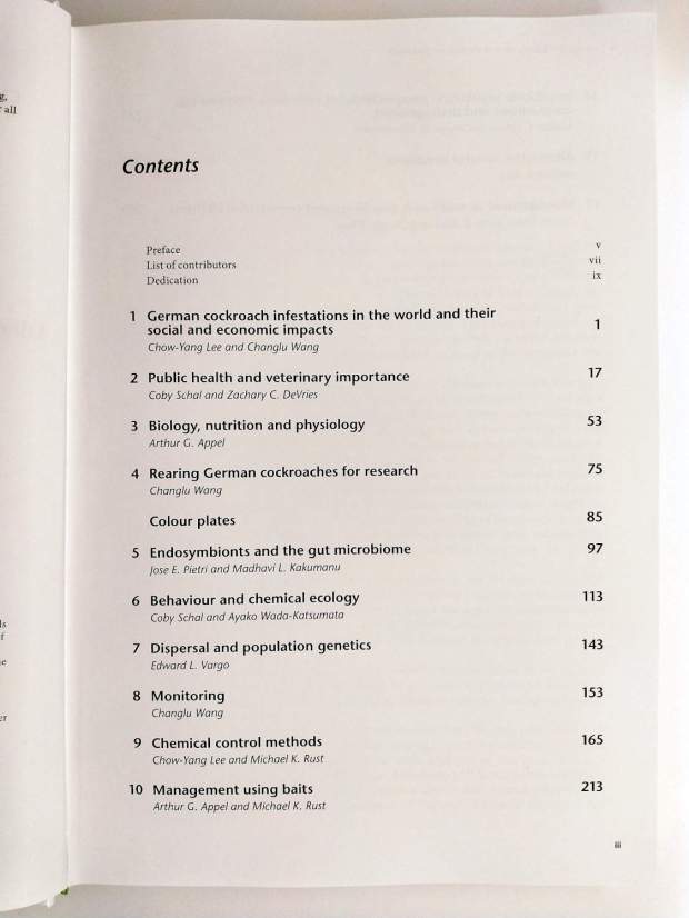 Esperaba con ganas la publicación del libro ‘Biology and Management of the German Cockroach’. A principios de año, aparecía en prensa en la página web del Centre for Agriculture and Biosciences International, CABI (cabi.org). Pero no ha sido hasta hace pocas semanas que lo he visto disponible. No he dudado en adquirirlo porque se trata de una obra colectiva de gran valor escrita por nada más que 14 entomólogos (figuras 4-5). Tres de ellos, Changlu Wang, Chow-Yang Lee y Michael K. Rust, en calidad de editores.