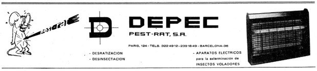 Se menciona el producto Pest-Rat, pero no se da detalle de qué es. Aparece como si el lector supiera de que se trata por ser un producto famoso de la casa. Entonces recordé que en publicidad antigua de Depec aparece la palabra Pest-Rat. En la imagen número 2 se puede ver un anuncio insertado en el periódico La Vanguardia en el que bajo la marca Depec aparece la razón social Pest-Rat SA. Se puede ver un dibujo de un ratón con una flecha que representa el Pest-Rat apuntando al estómago. Entonces pregunté a Servicios Depec SL si recordaban que utilizaran antaño un raticida a base de Salmonella. Pero no sabían nada al respecto a pesar de contar con personas con una larga trayectoria en la compañía.