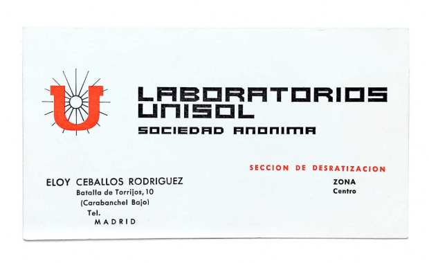 Por otra parte, he encontrado un interesante documento. En la imagen número 1, se puede ver una tarjeta de visita de Laboratorios Unisol. Aparece el nombre de Eloy Ceballos Rodríguez. Y se menciona su pertenencia a la Sección de Desratización de la Zona Centro. Buscando información sobre esta persona, aparece como administrador en Depec Centro SL, constituida en 1978 en Madrid y en activo en la actualidad.