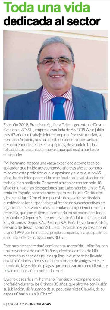 Por suerte, encontré un dato clave en el número 82/2018 de la revista ‘Infoplagas’, órgano divulgativo de la asociación de control de plagas ANECPLA. Se dedica uno de sus apartados (‘Toda una vida dedicada al sector’) a Francisco Aguilera Tejero, gerente de Desratizaciones 3D SL de Córdoba y recién jubilado [8]. El texto está escrito en su mayor parte por su hermano Francisco quien da cuenta de su dilatada trayectoria. Se explica que empezó a trabajar con 18 años en la delegación de Laboratorios Unisol, la cual daba servicio a Andalucía Occidental y Extremadura.
