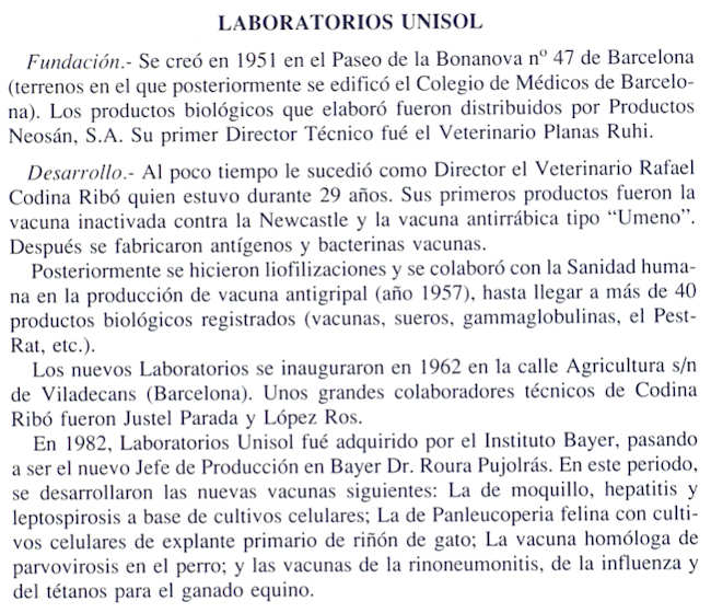 Empecé a investigar sobre la razón social Depec. Tirando del hilo llegué hasta Laboratorios Unisol SA de Barcelona que se encuentra en el origen de Depec. Fue clave encontrar el libro ‘Historia de los medicamentos veterinarios en Catalunya y de sus laboratorios farmacéuticos-veterinarios’ de 1993 [7]. En la página 34 se explica la historia de Laboratorios Unisol (figura 3). Fueron fundados en 1951 para la fabricación de productos biológicos como sueros, vacunas, antígenos, etc. Estos laboratorios se trasladaron a Viladecans en 1972 y tuvieron vida independiente hasta que en 1982 fueron adquiridos por Bayer.
