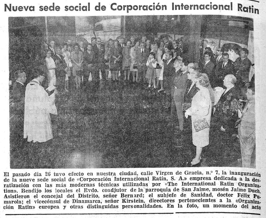 El negocio de desratización de CIRSA creció y pronto necesitó un espacio acorde a su tamaño. Consta que en 1967 se trasladaron a un nuevo espacio en la calle Virgen de Gracia, 7. De ello da cuenta la ‘Hoja Oficial de la Provincia de Barcelona, 29 de mayo de 1967 (figura 9). Se puede ver una pequeña noticia ilustrada con una fotografía de la inauguración de la nueva sede. Tuvo su pompa y acudieron personalidades.